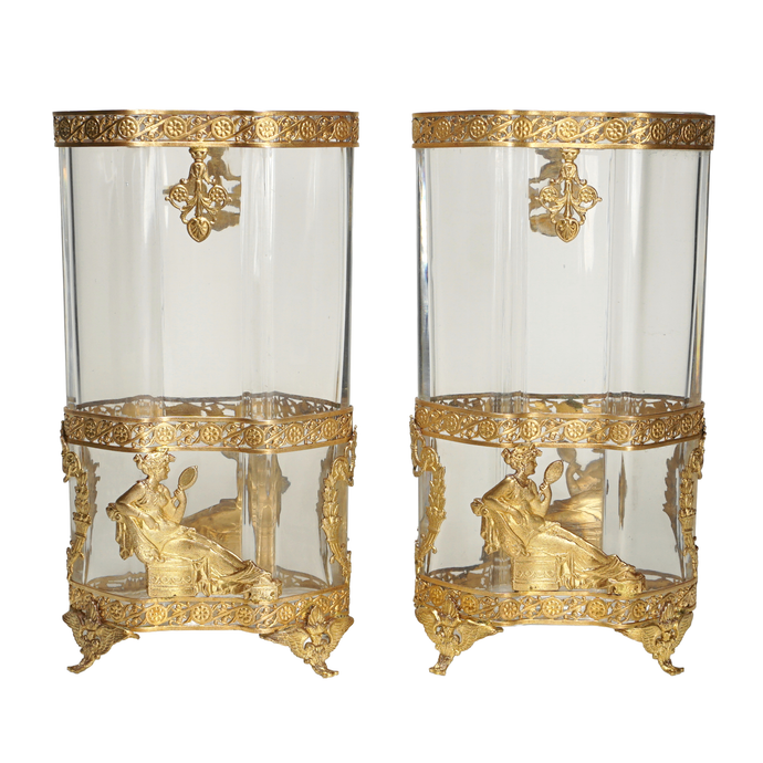 Pair Antique French Glass & Gilt Ormolu Vases Empire Neoclassical Style