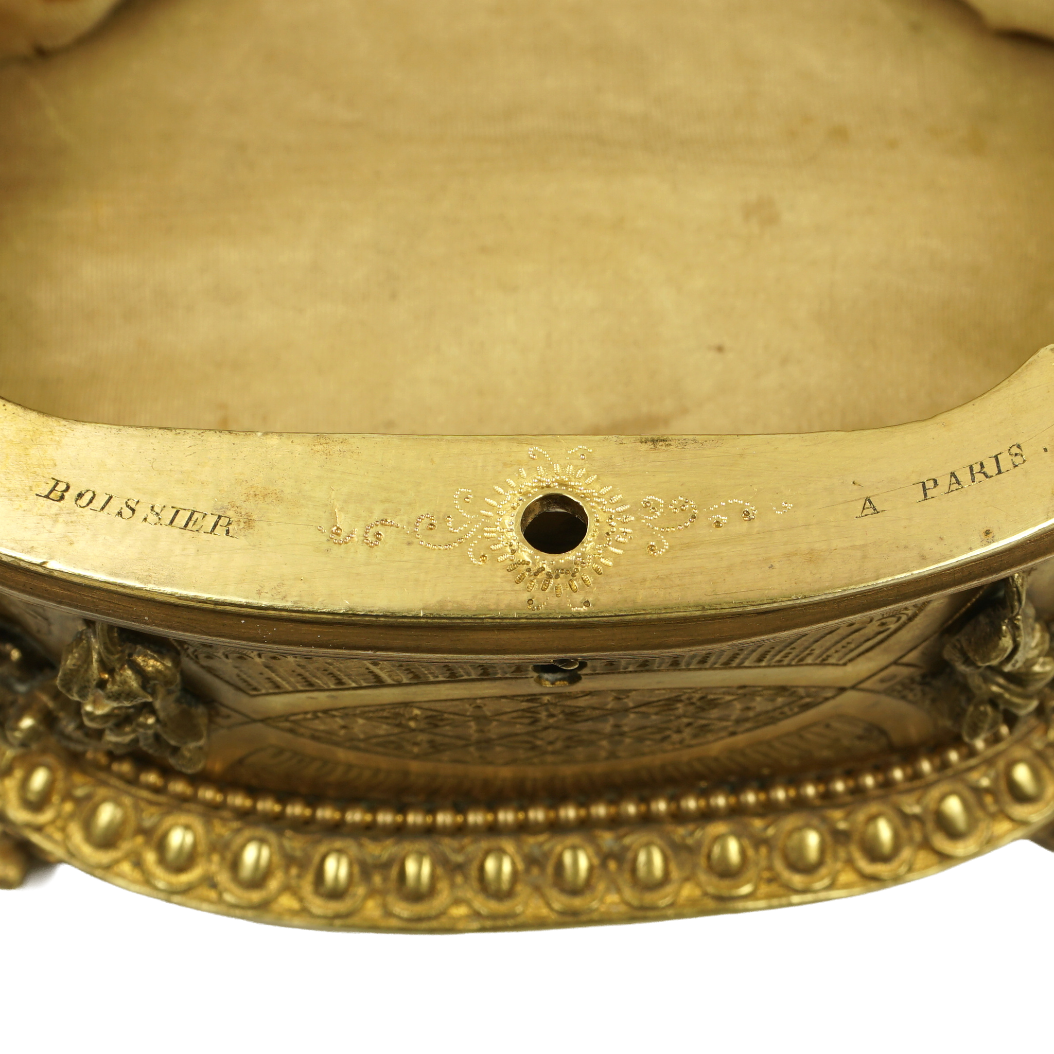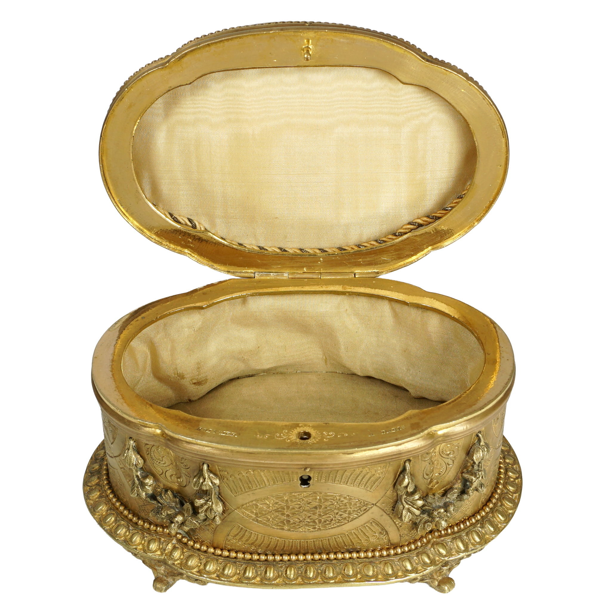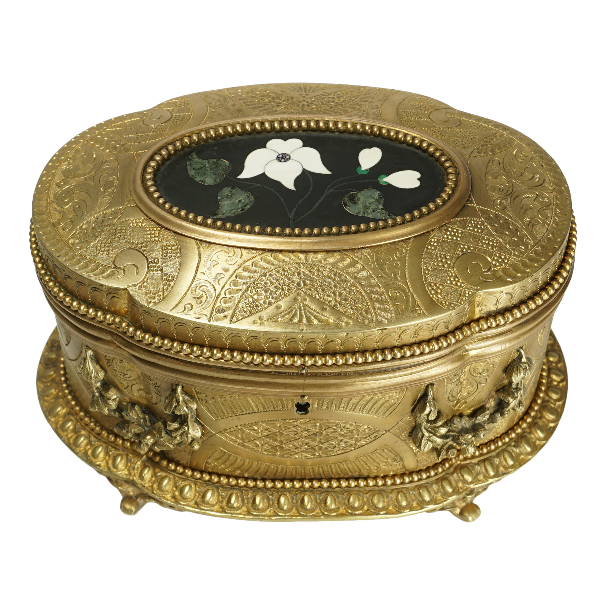 Antique 19th century gilt bronze jewelry box. Features an oval shaped pietra dura plaque inset to the lid. The stone inlay in the form of a figural bouquet of flowers against a black marble ground, comprising of white lilies and green foliage, displaying vert de patricia and malachite, the center with a millefiori tesserae. Lilies being the symbol of the city of Florence. The box is adorned with intricate engraving and finely casted floral garlands. Resting on four ornate feet. The center of the box with a lock and opening to reveal a fabric lined interior. Signed Boissier Paris, for the renown confectioner. In overall good antique condition with general wear commensurate with age and use. Lacking a key. The pietra dura plaque having a small lack to the stem of one leaf, otherwise presents beautifully. Measures 6 1/2" c 4 3/8" x 3 3/4" height.