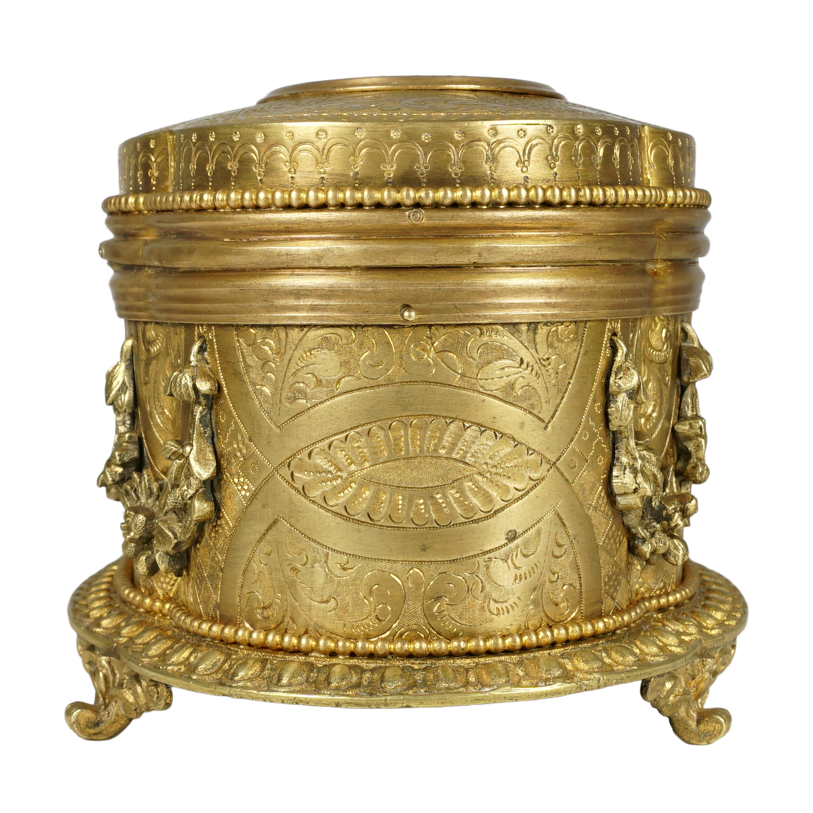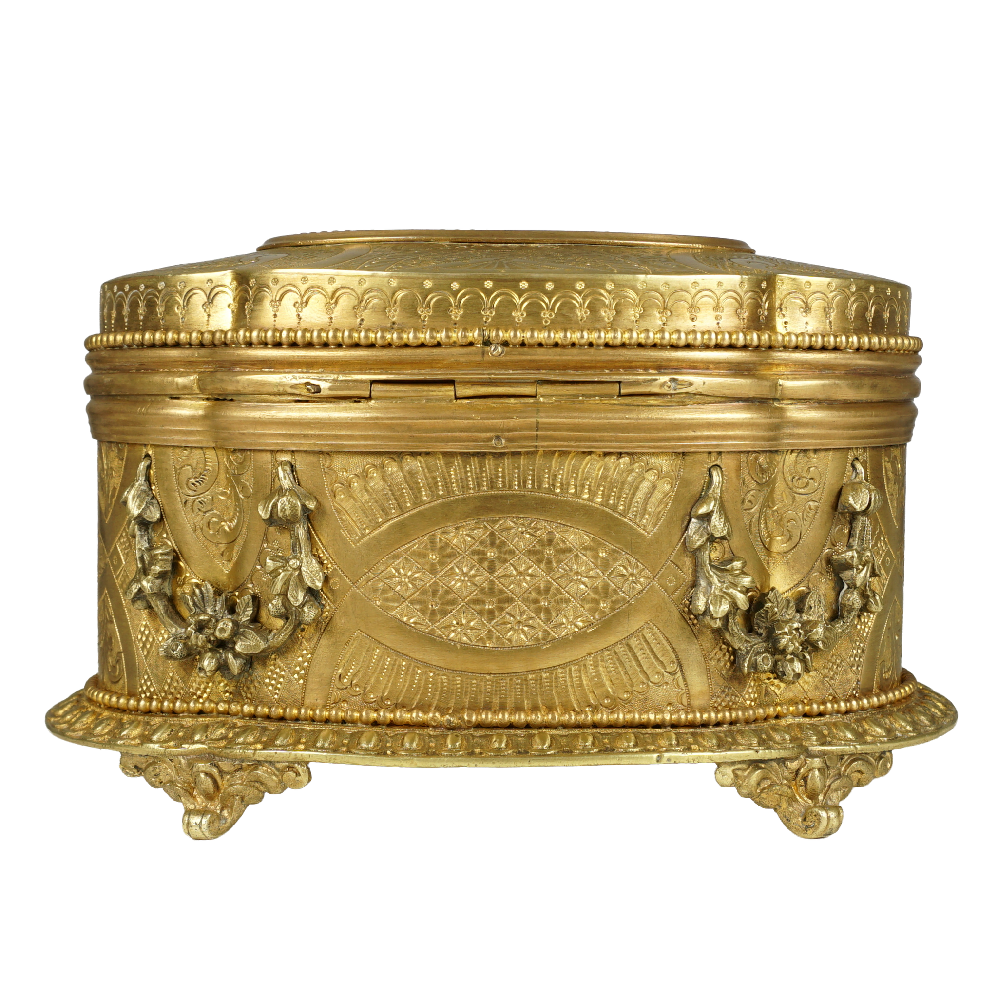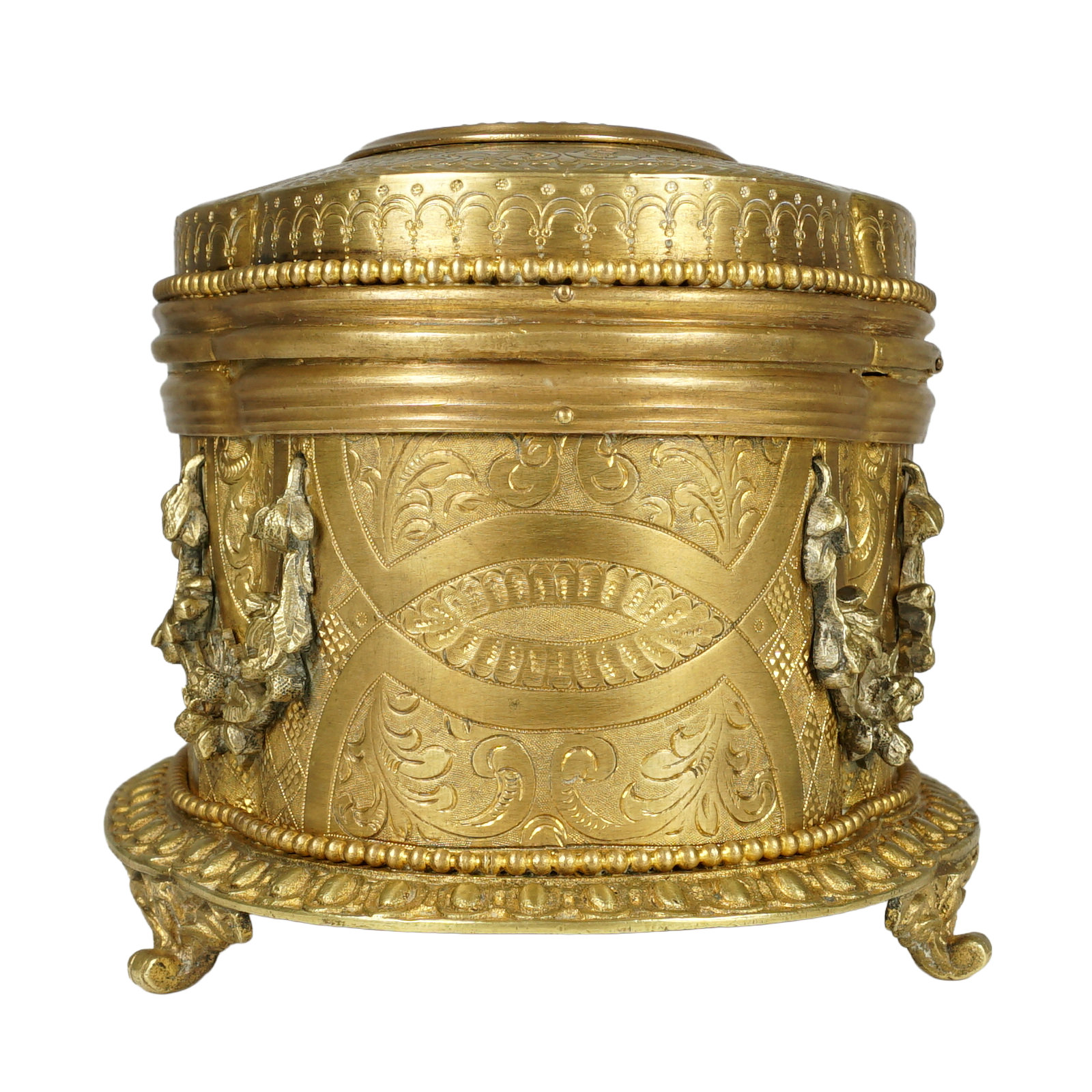 Antique 19th century gilt bronze jewelry box. Features an oval shaped pietra dura plaque inset to the lid. The stone inlay in the form of a figural bouquet of flowers against a black marble ground, comprising of white lilies and green foliage, displaying vert de patricia and malachite, the center with a millefiori tesserae. Lilies being the symbol of the city of Florence. The box is adorned with intricate engraving and finely casted floral garlands. Resting on four ornate feet. The center of the box with a lock and opening to reveal a fabric lined interior. Signed Boissier Paris, for the renown confectioner. In overall good antique condition with general wear commensurate with age and use. Lacking a key. The pietra dura plaque having a small lack to the stem of one leaf, otherwise presents beautifully. Measures 6 1/2" c 4 3/8" x 3 3/4" height.