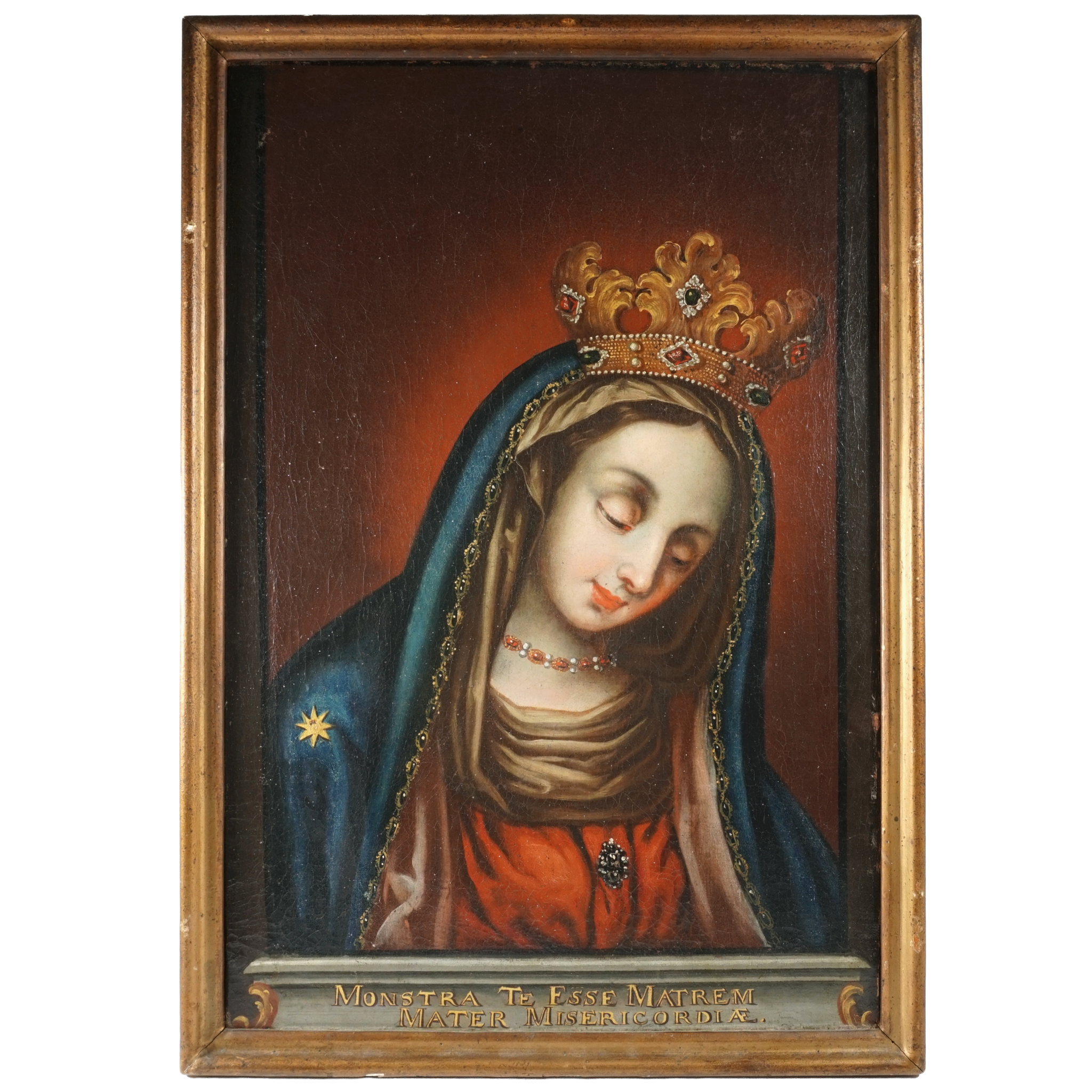 Antique 19th-century Alpine School portrait of Mary the Queen (Maria Königin). Oil painting on canvas. Depicting the Virgin Mary with a gentle expression, Our Lady of the Bowed Head. She wears a crown adorned with pearls and red and green gems, signifying her role as Queen of Heaven. The blue color of her robe traditionally represents divinity, heaven, and fidelity. Visible on her shoulder is a gilded star identifying her as the "Stella Maris" or "Star of the Sea," a title symbolizing her role as a guide for the faithful. The text at the base reads, "Monstra Te Esse Matrem, Mater Misericordiae", a Latin phrase translating to "Show yourself to be a Mother, Mother of Mercy". Taken from the ancient Ave Maris Stella hymn and the Salve Regina, this prayer asks the Virgin Mary to act as a loving mother to humanity, interceding on their behalf. In overall good antique condition with general wear and craquelure commensurate with age and use. There are some touch-ups and paint loss along the perimeter. Housed in a wooden frame, the frame showing some scattered lacks to the edges. Frame measures 30" x 21" x 1 5/8" deep. Canvas measures 28" x 18 7/8".