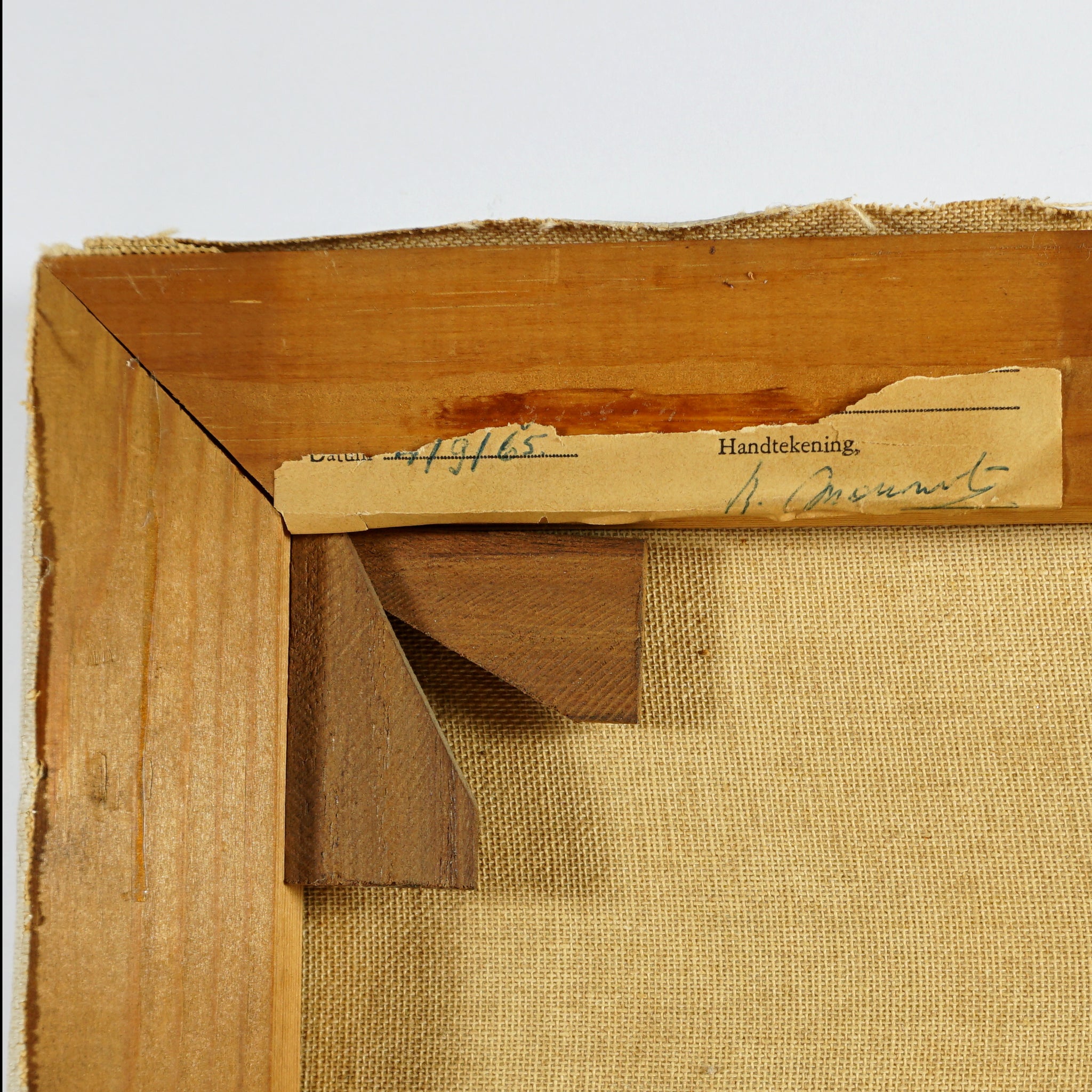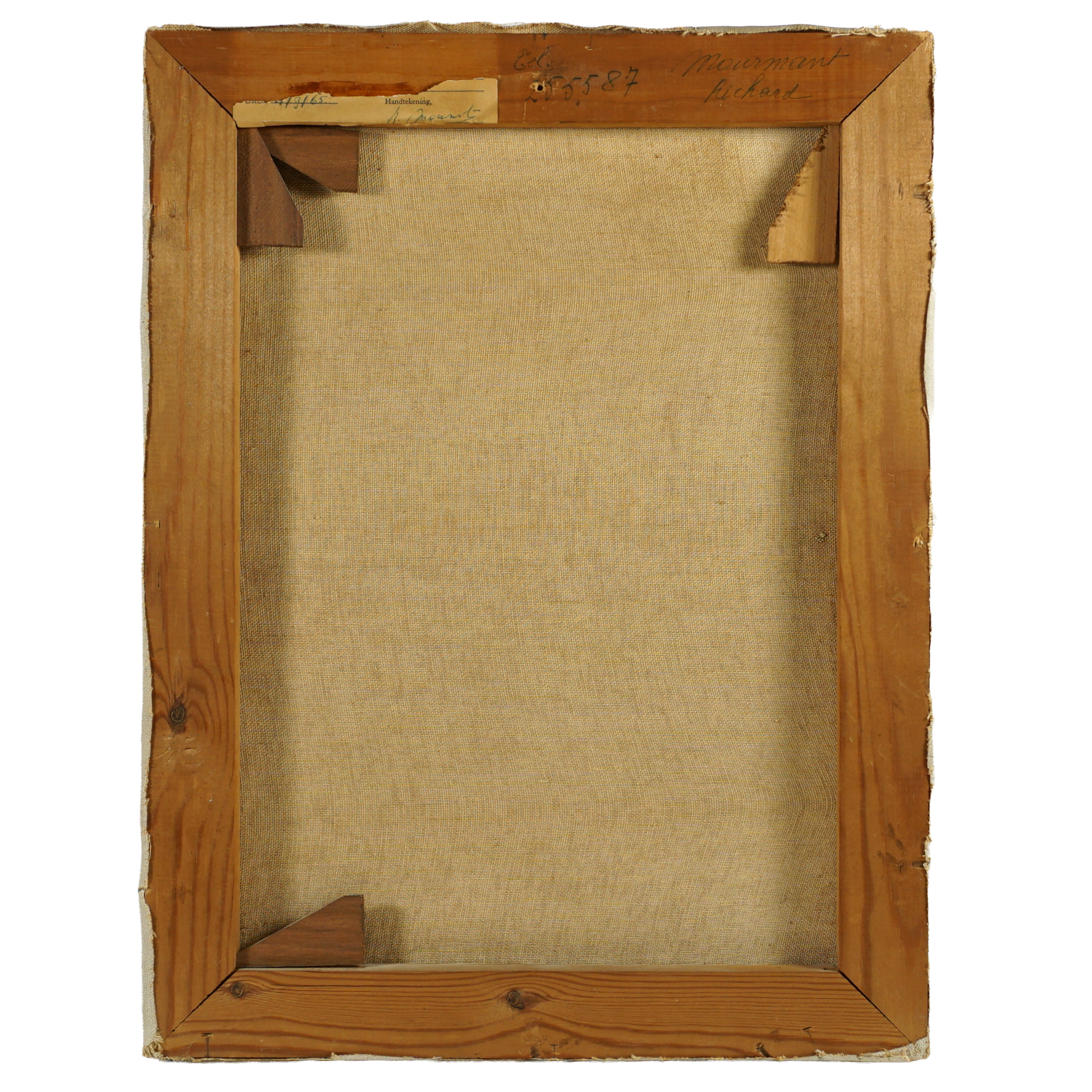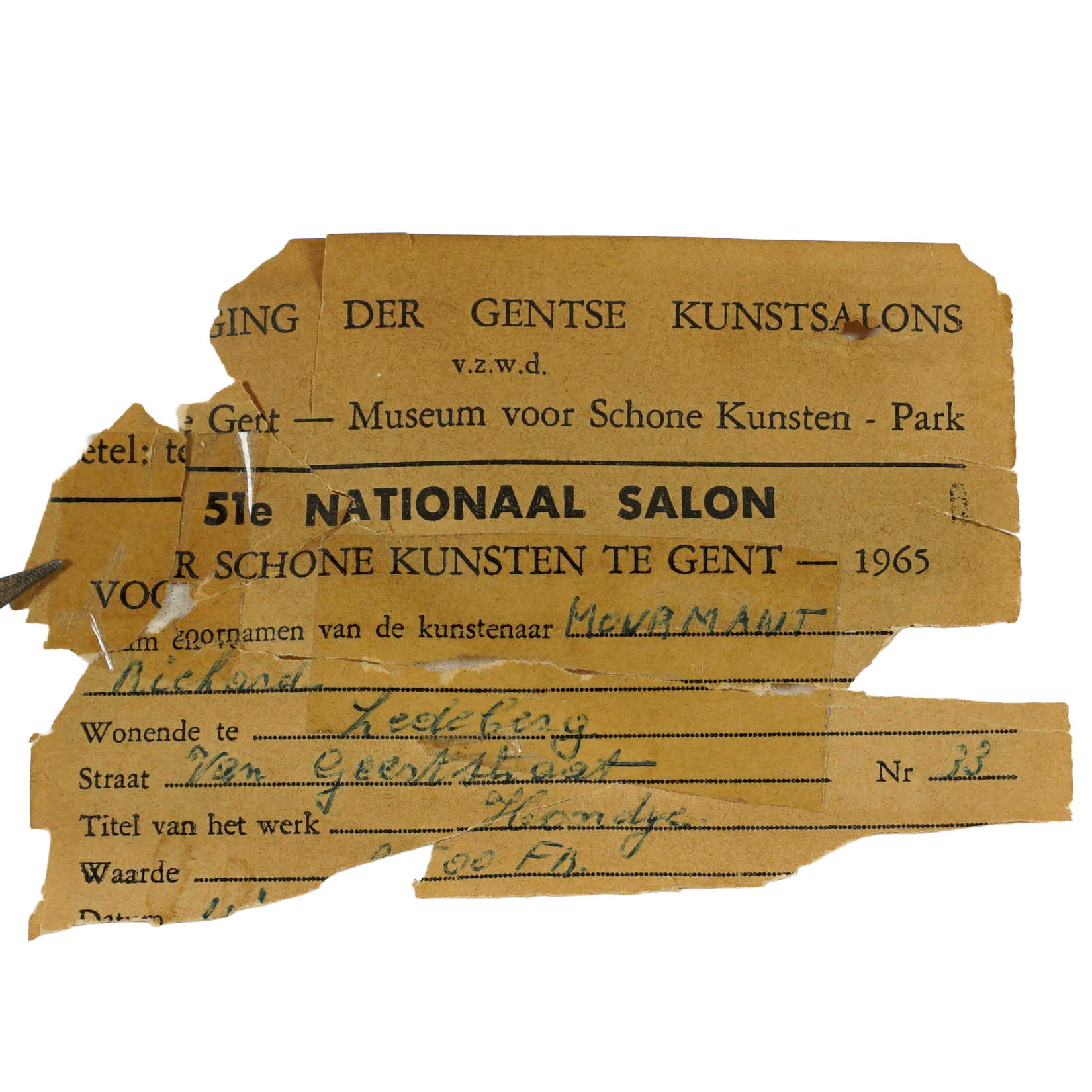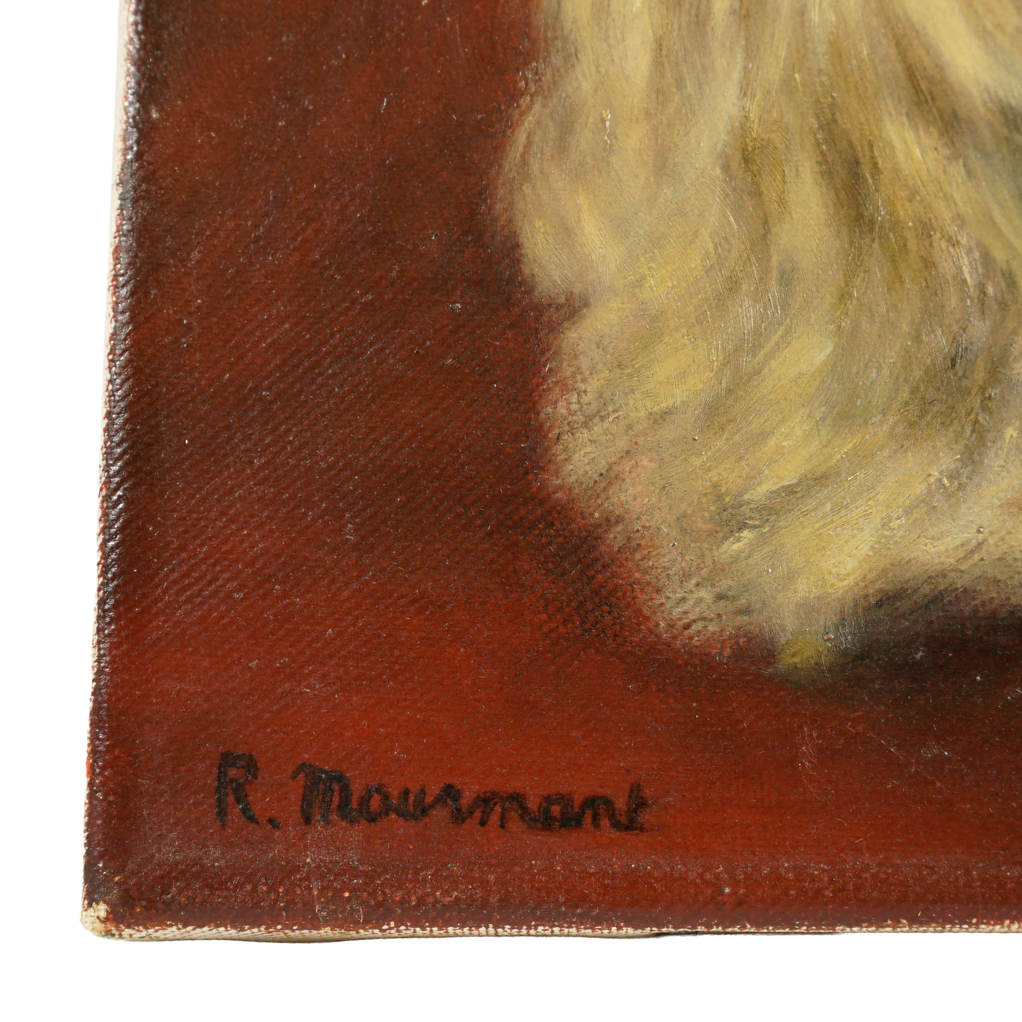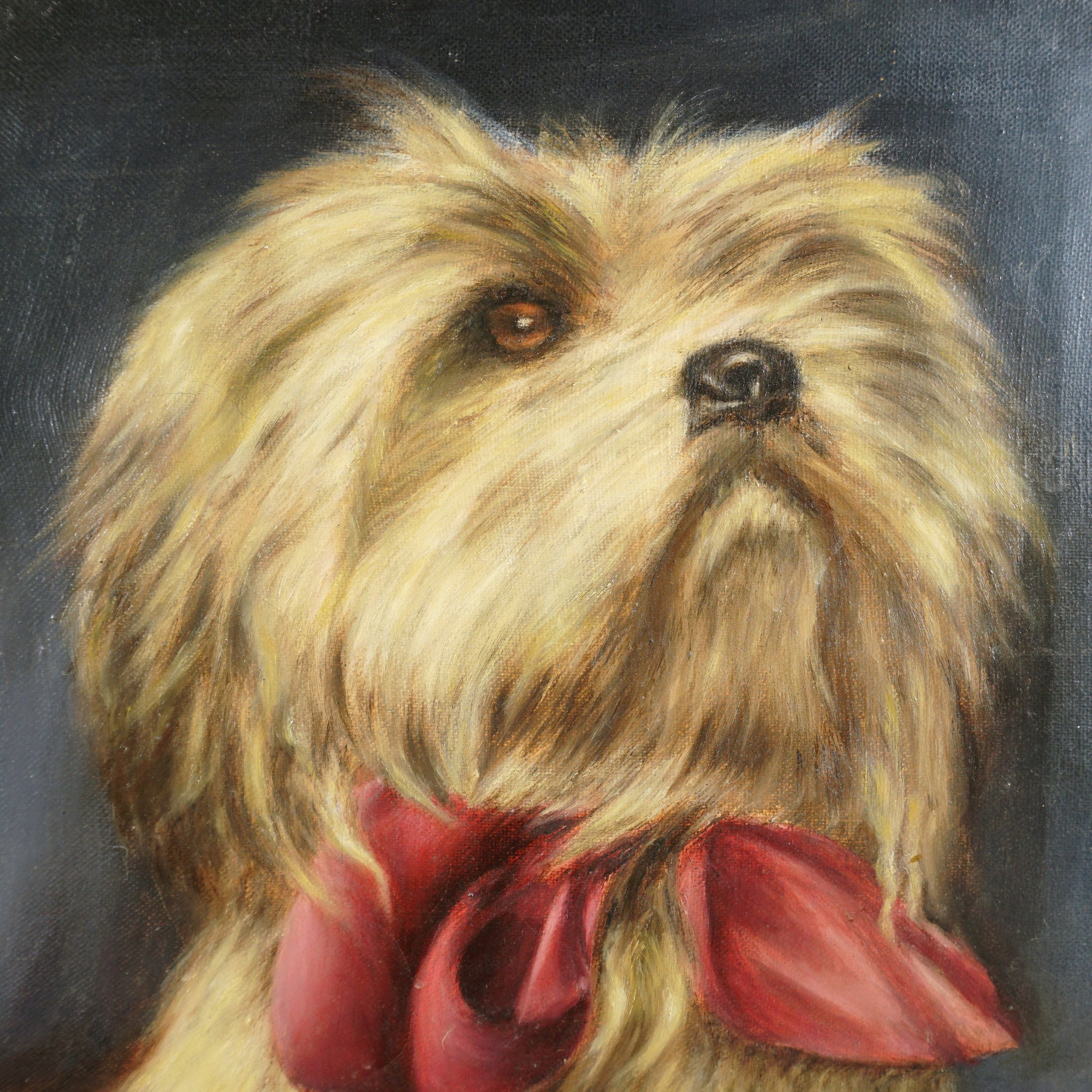 Charming vintage Flemish school portrait of a small dog by Richard Mourmant. The painting depicts a terrier or shih tzu in a seated pose with a large bow. Oil painting on canvas. Unframed. Signed lower left R. Mourmant. Dated 1963 at the lower right. Partial label indicates the painting was exhibited in the 51st National Salon at the Museum of Fine Arts in Ghent in 1965. Painting is titled 'Hondje', meaning puppy or little dog in Dutch. In overall good vintage condition with general wear commensurate with age and use, some paint loss to the edge that will mostly likely be hidden once framed. Measures 15 3/4" x 11 7/8". The 51e Nationaal Salon voor Schone Kunsten (51st National Salon of Fine Arts) was a major art exhibition held in Ghent, Belgium, from October 2 to November 14, 1965. It was organized by the Vereniging der Gentse Kunstenaars (The Ghent Art Salons) . The exhibition took place at the Museum voor Schone Kunsten (MSK) in Ghent, a beautiful historic building housing a significant collection of European art, often mentioned in the context of the city's art scene, including famous works like the Ghent Altarpiece. The exhibition featured a wide range of Belgian artists, including Roger Van de Wouwer.