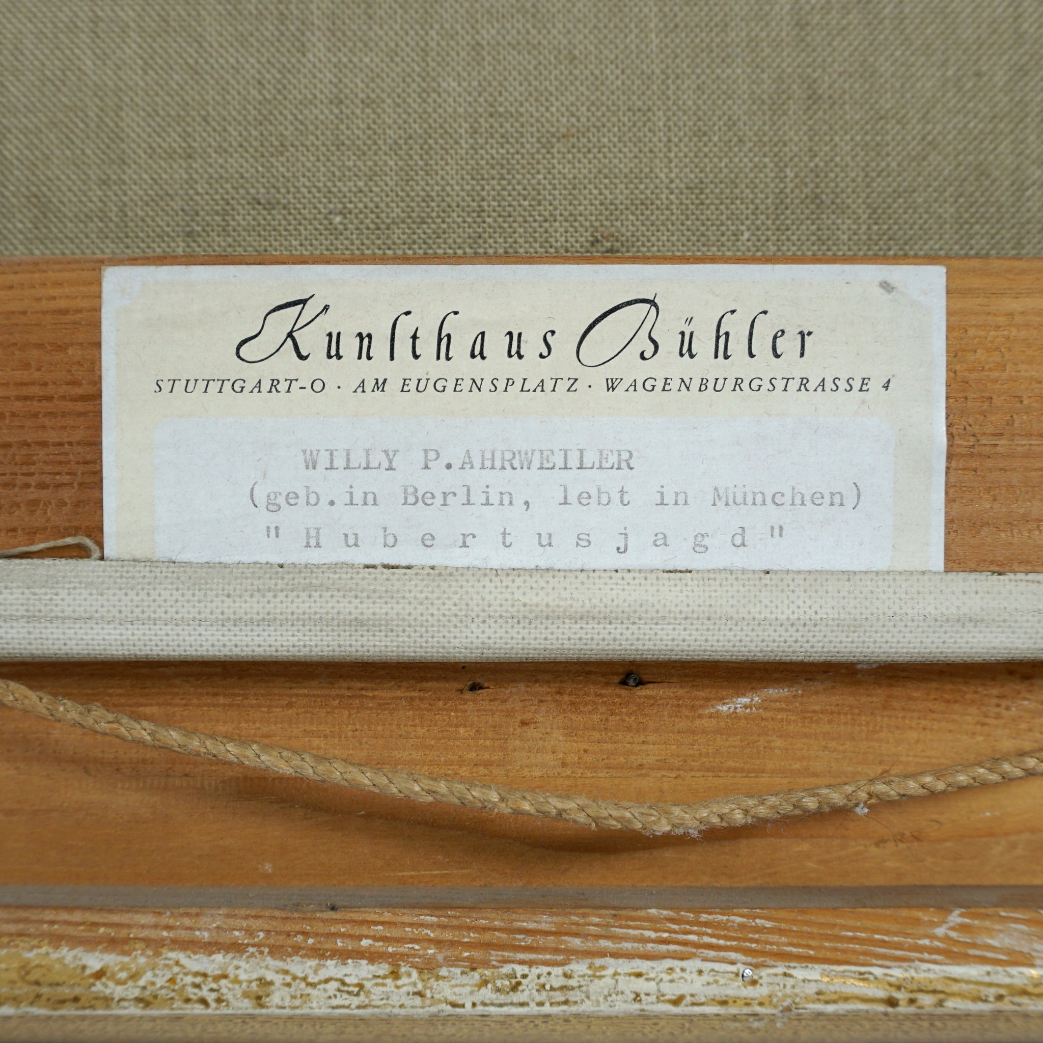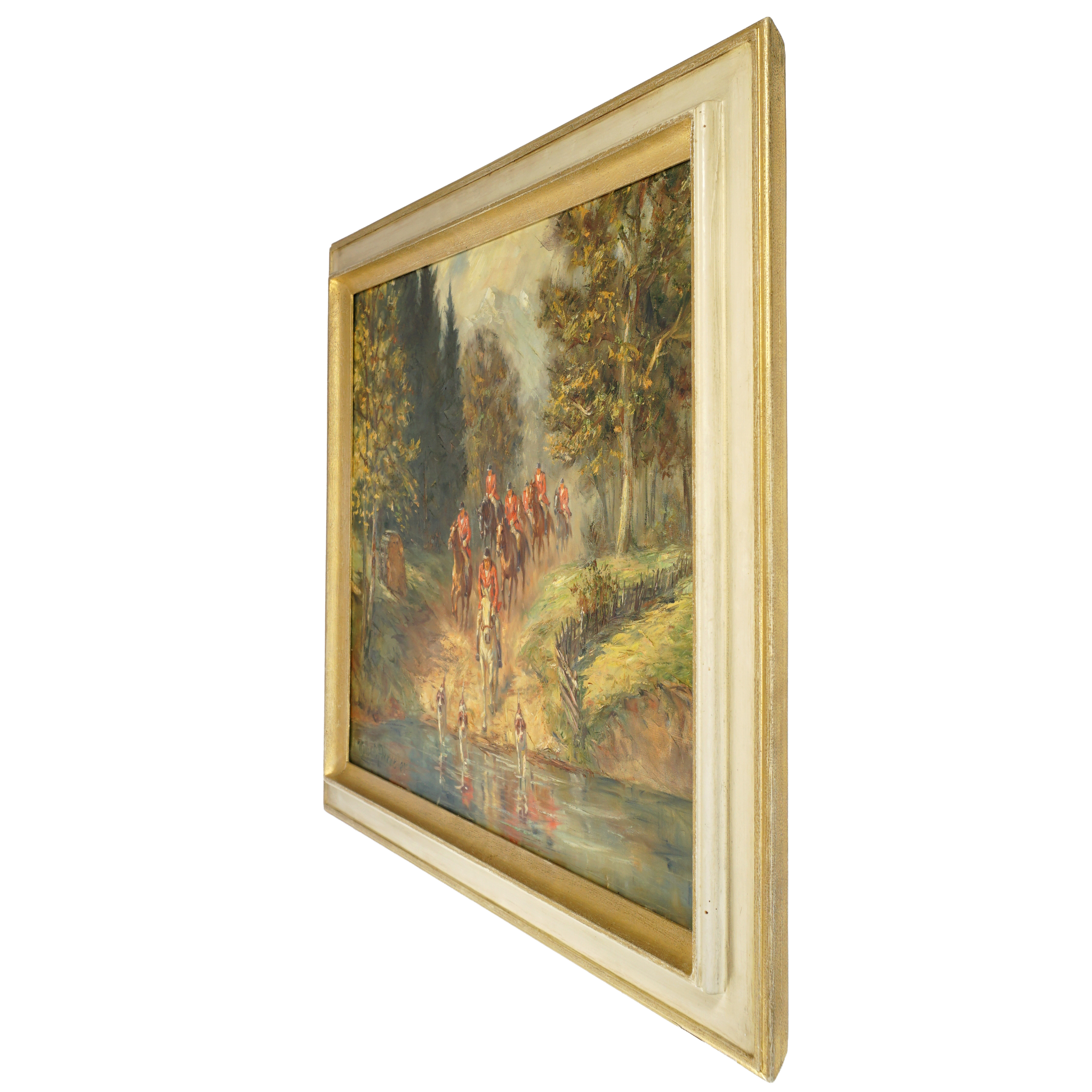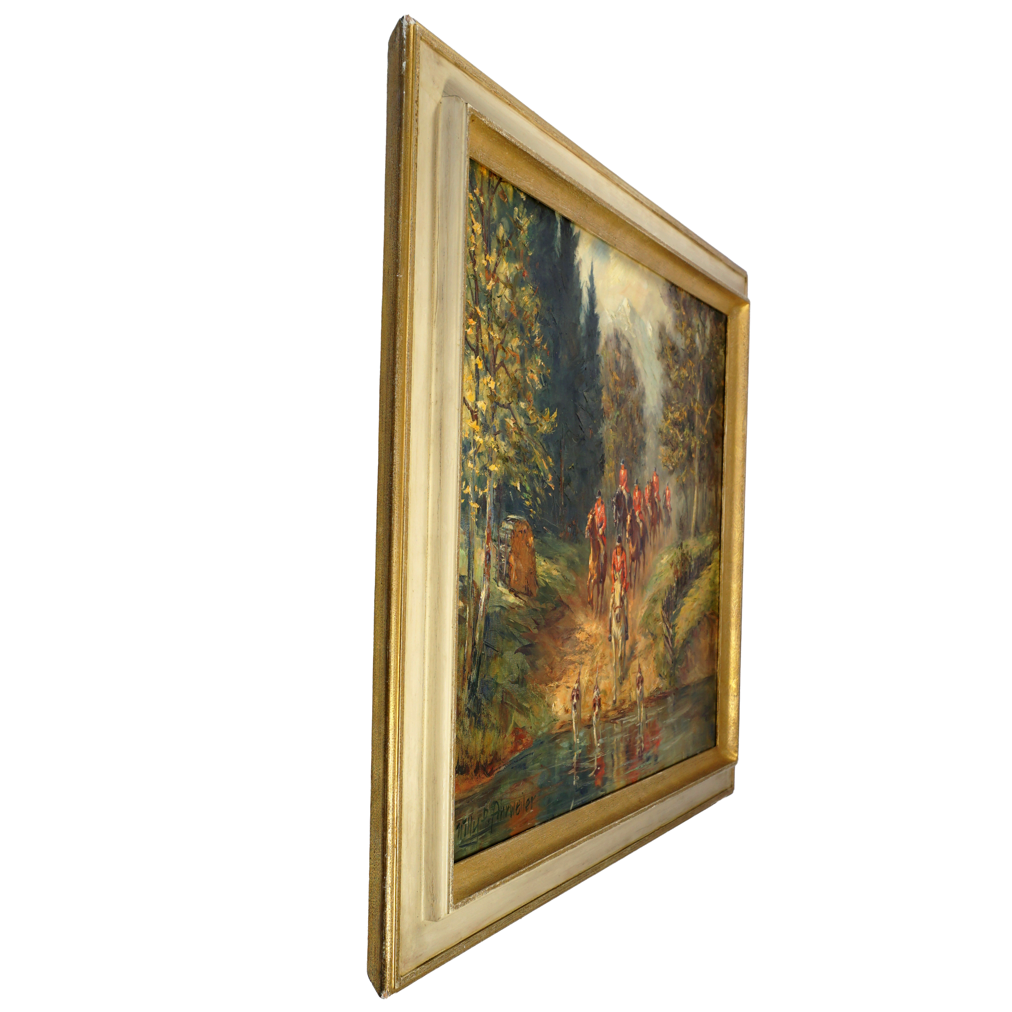 Vintage oil painting depicting an English hunting party beautifully executed by German artist Wihelm Peter Ahrweiler (1905-1987). Showcasing riders in traditional red jackets (pinks) on horseback crossing a stream with hunting hounds. An impressionistic landscape scene housed in a gilt wood frame. Titled 'Hubertusjagd', St. Hubertus Hunt, for the traditional "Hunter's Mass" hunt held around St. Hubertus Day (Nov 3). The painting is signed in the lower left corner, Willy P Ahrweiler. Known for his animal portraits and active in Munich, Ahrweiler studied at the Düsseldorf Academy under Wilhelm Döringer and Julius Paul Junghanns, from 1934 further training at the Munich School of Arts and Crafts under Josef Hillerbrand and master student of Prof. Richard Klein, where he honed his skill in capturing the beauty and expression of animals. In overall good vintage condition. The frame with general wear commensurate with use and age. Label on the back for the art gallery Kunsthaus Bühler located at Wagenburgstraße 4, Stuttgart, Germany. Frame measures 28 1/2" x 24 1/2" x 1 3/4" deep. Canvas measures 24" x 20".