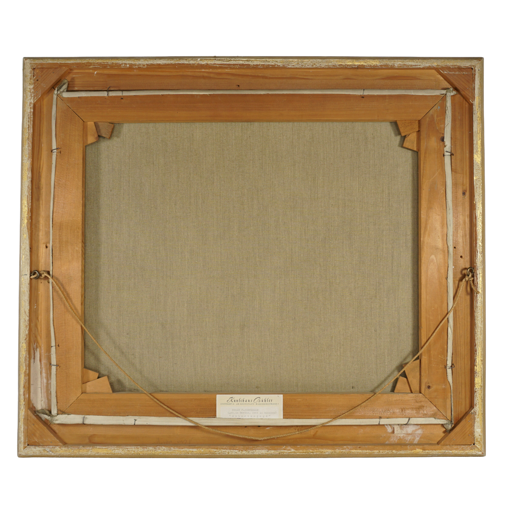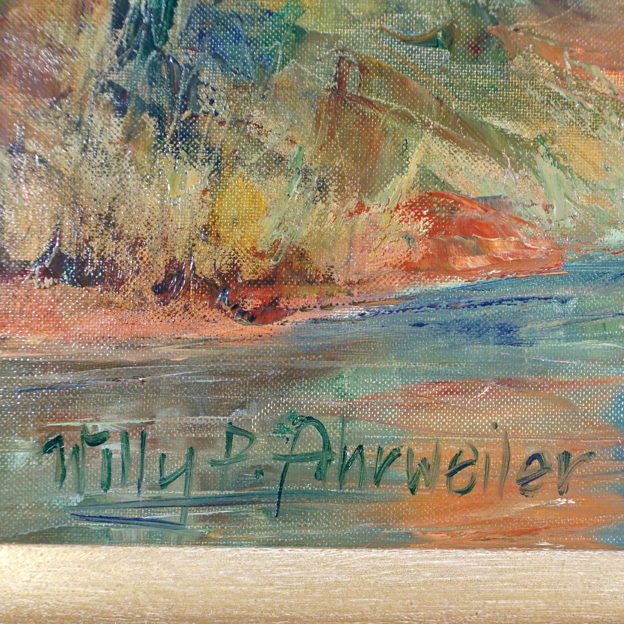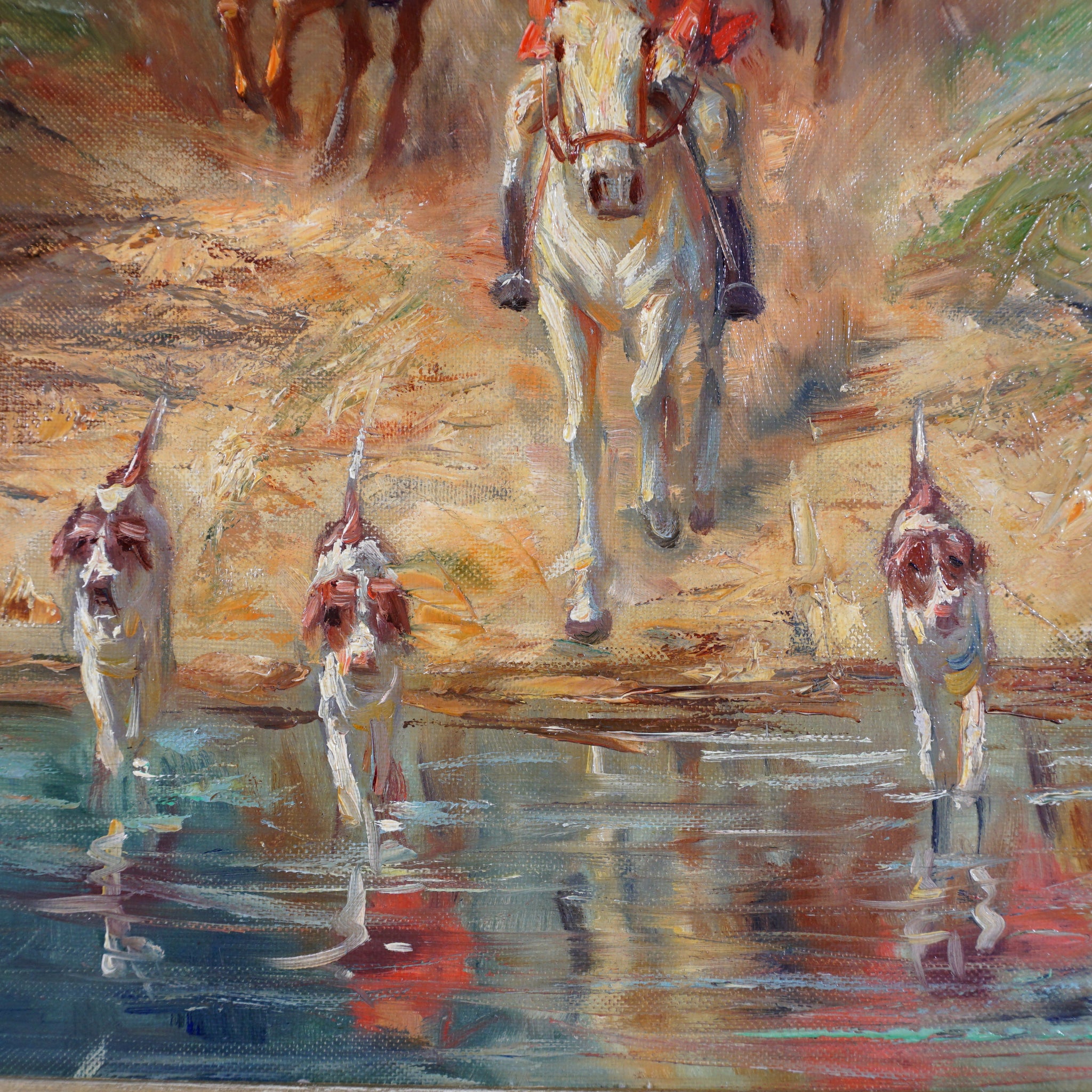 Vintage oil painting depicting an English hunting party beautifully executed by German artist Wihelm Peter Ahrweiler (1905-1987). Showcasing riders in traditional red jackets (pinks) on horseback crossing a stream with hunting hounds. An impressionistic landscape scene housed in a gilt wood frame. Titled 'Hubertusjagd', St. Hubertus Hunt, for the traditional "Hunter's Mass" hunt held around St. Hubertus Day (Nov 3). The painting is signed in the lower left corner, Willy P Ahrweiler. Known for his animal portraits and active in Munich, Ahrweiler studied at the Düsseldorf Academy under Wilhelm Döringer and Julius Paul Junghanns, from 1934 further training at the Munich School of Arts and Crafts under Josef Hillerbrand and master student of Prof. Richard Klein, where he honed his skill in capturing the beauty and expression of animals. In overall good vintage condition. The frame with general wear commensurate with use and age. Label on the back for the art gallery Kunsthaus Bühler located at Wagenburgstraße 4, Stuttgart, Germany. Frame measures 28 1/2" x 24 1/2" x 1 3/4" deep. Canvas measures 24" x 20".