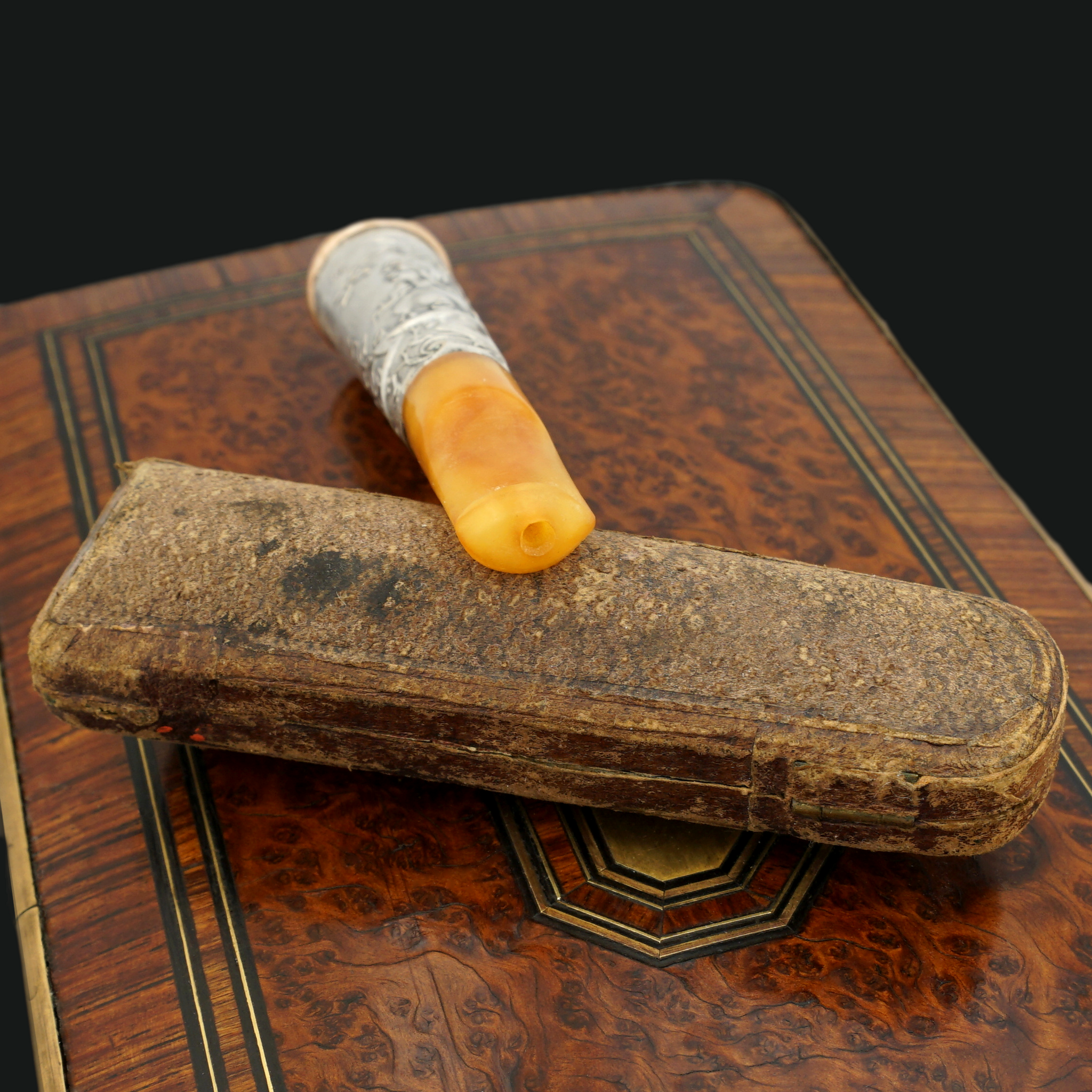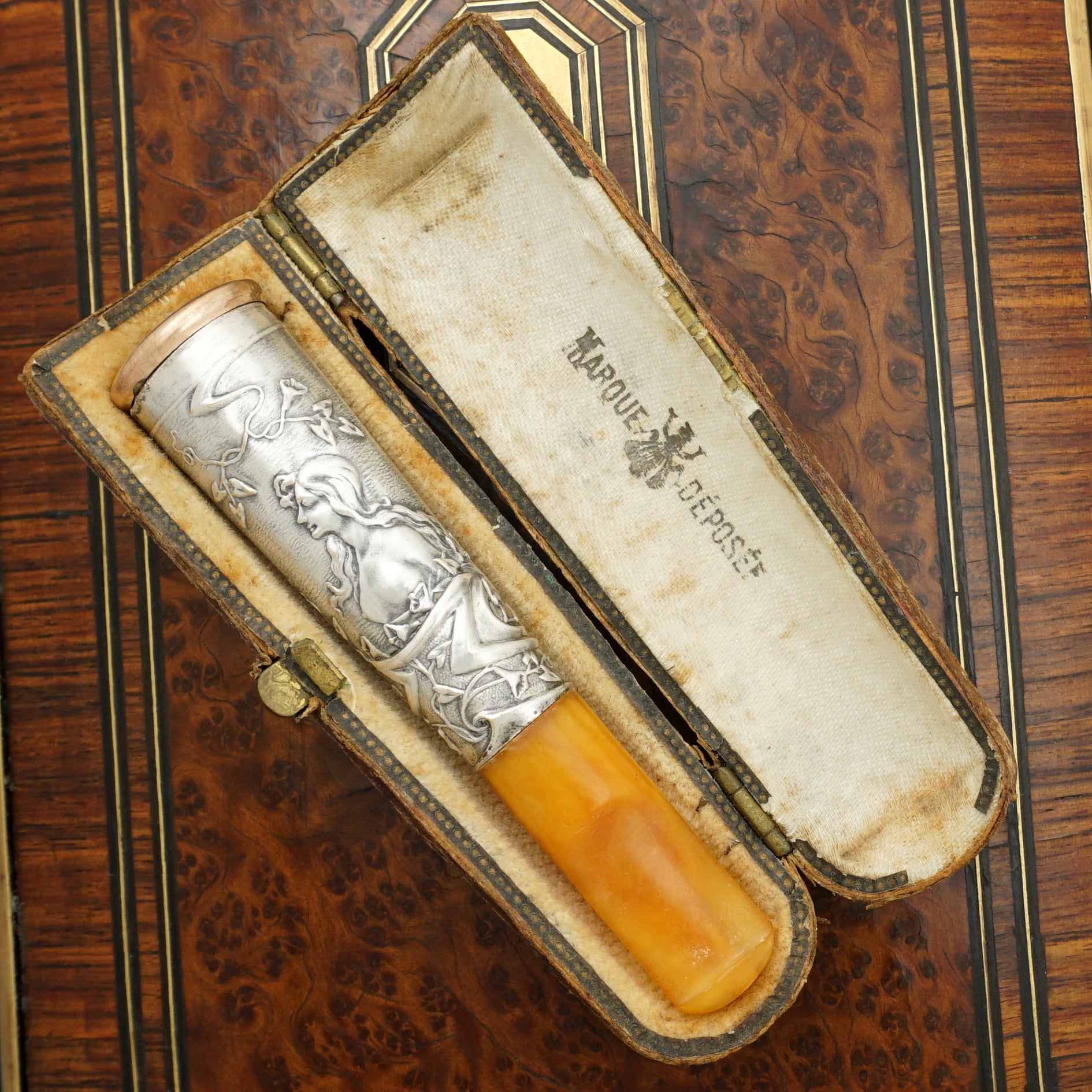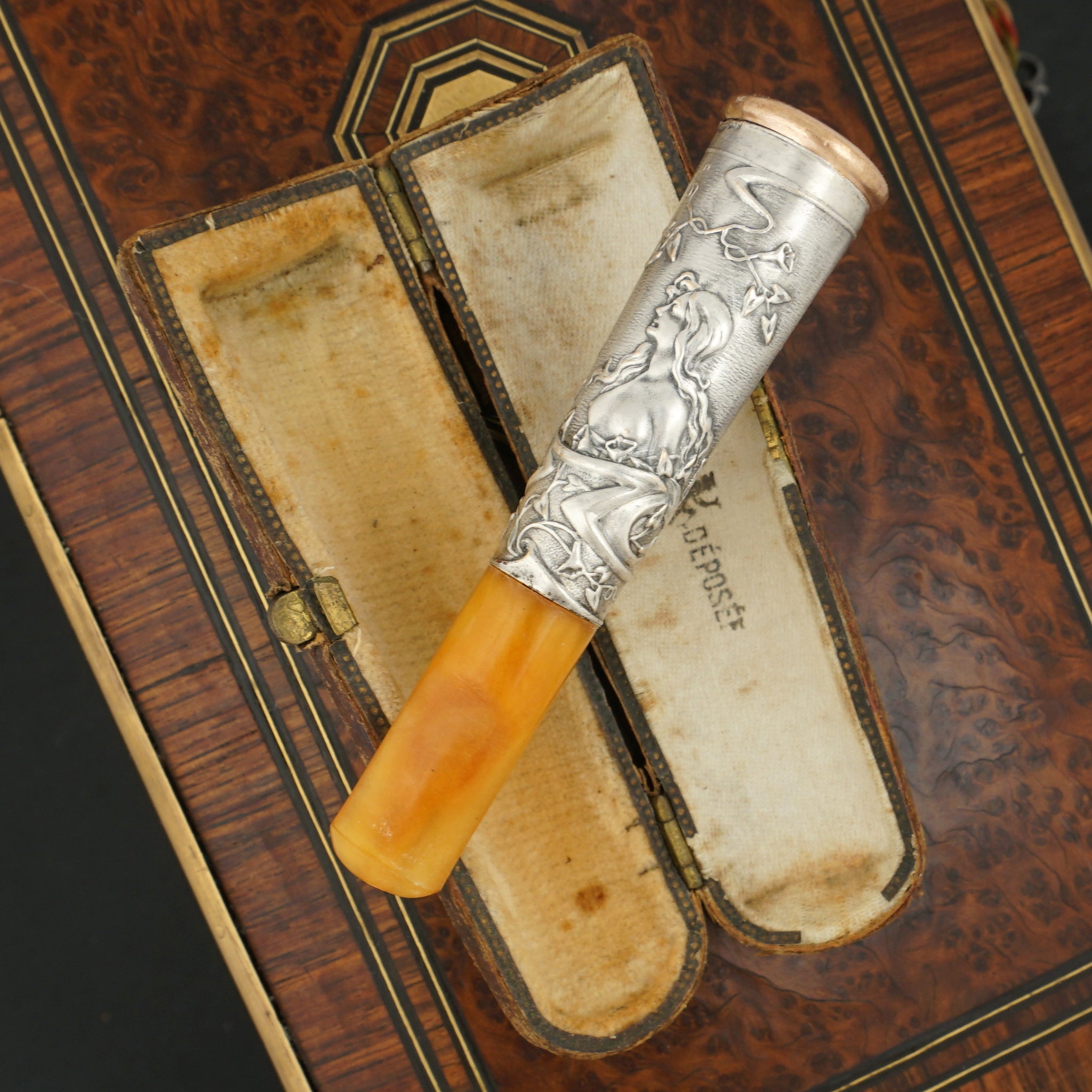 Antique Art Nouveau era French amber cheroot or small cigar holder. Comprising of a silvered metal collar mounted at the end with a gold vermeil finish rim. Richly decorated in raised relief with a woman surrounded by morning glories and leaves on swirling vines. Tapered amber mouth piece. Housed in the original etui case. In overall good antique condition with general wear commensurate with age and use. <easures 3 1/4" length x 11/16" width, with a 7/16" diameter opening aperture. Case measures 3 5/8" length x 1 1/8" wide.
