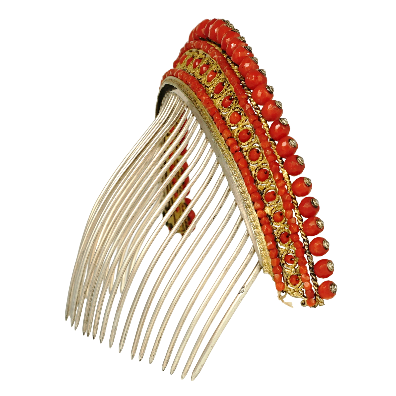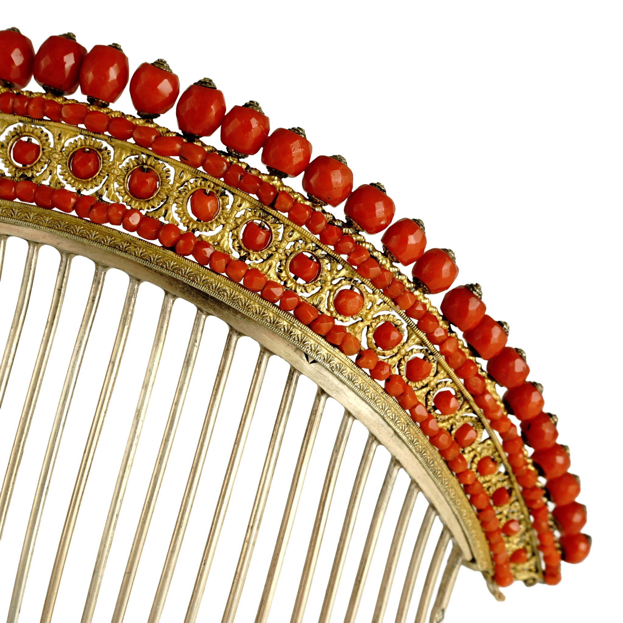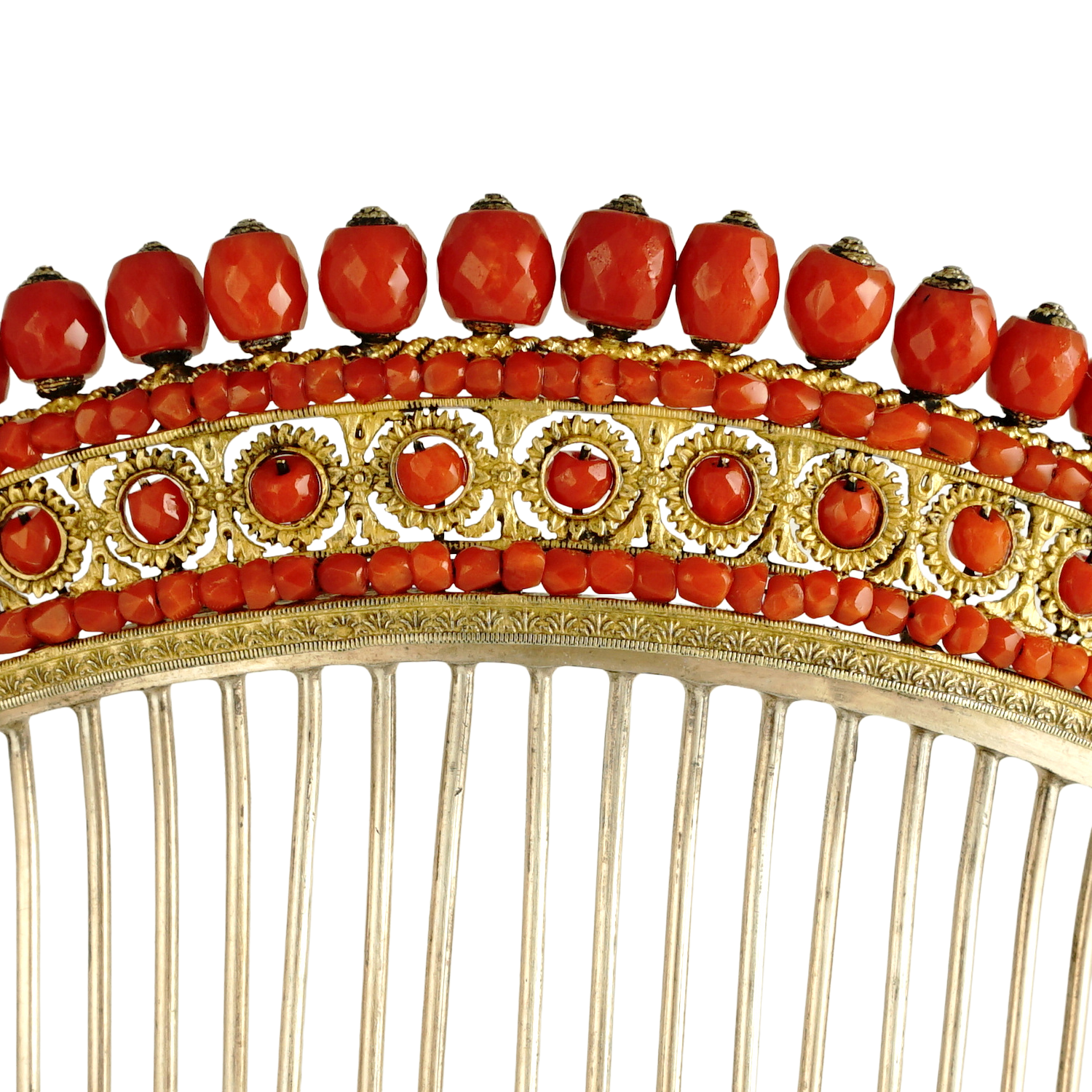 Antique French Empire tiara diadem hair comb dating to the early 19th century comprising of gilt vermeil silver and natural red coral beads. Featuring a gallery with a single row of coral beads resting above an embossed frieze of neoclassical palmettes. Centered by an openwork gallery of coral beads suspended within a sunflower motif. Further decorated with a row of coral beads topped with twisted rope decoration and crowned with larger faceted coral. In very good condition with general wear from use and age with no missing coral. Hallmarked with the head of a hare. This mark was typically used on small silver items and is a guarantee mark (poinçon de garantie) placed by the Bureau de Garantie de Paris. In use from 1819 -1838, the mark indicates a silver content of at least .800/1000. On the comb is the mark of a horse's head to denote a silver finesse of .843/1000 silver, the mark first introduced in 1795. Hallmark of lictor fasces with axe for small silver guarantee for Paris 1809-1819. Maker's mark of the silversmith. Measures 6 1/4" across x 4 1/8" height. Weighs 82.1 grams.