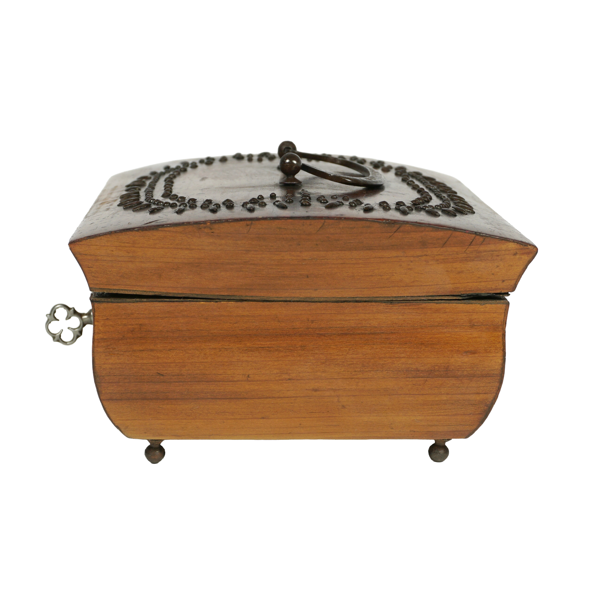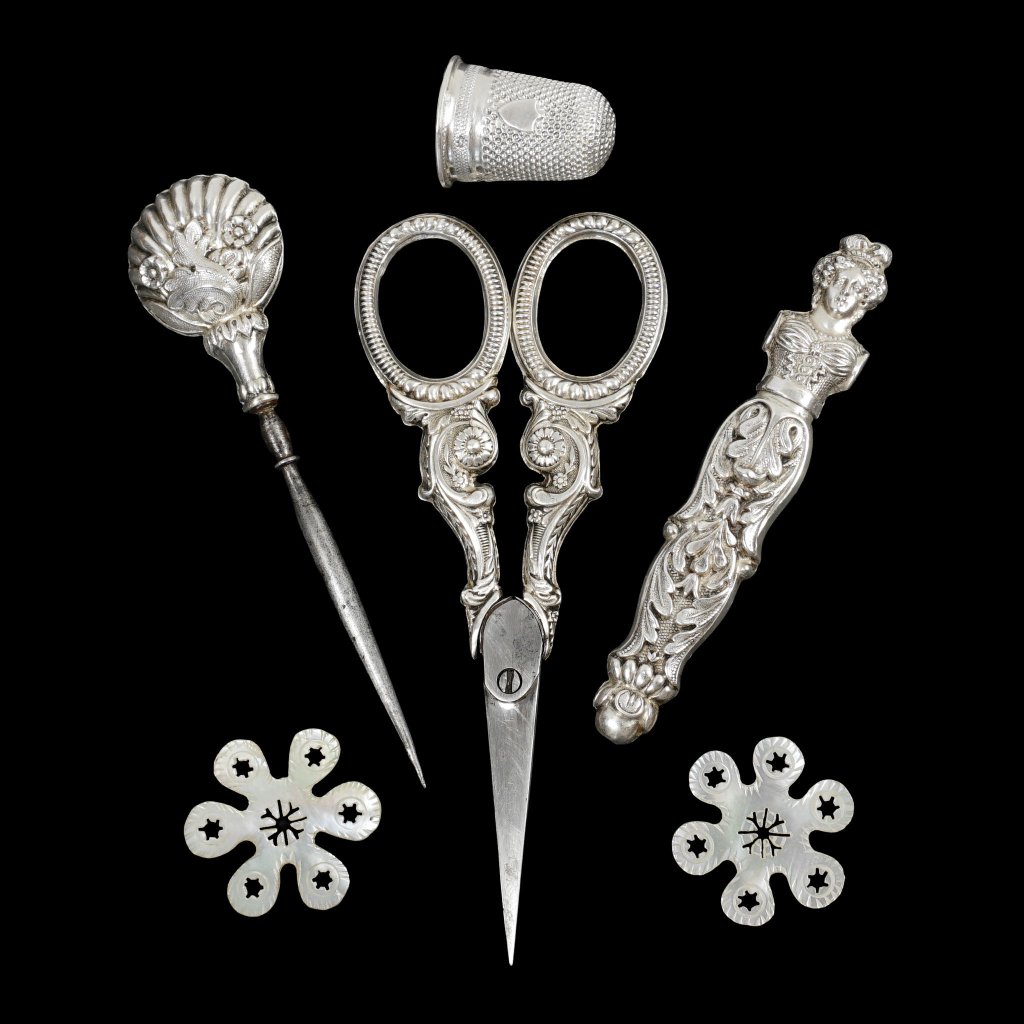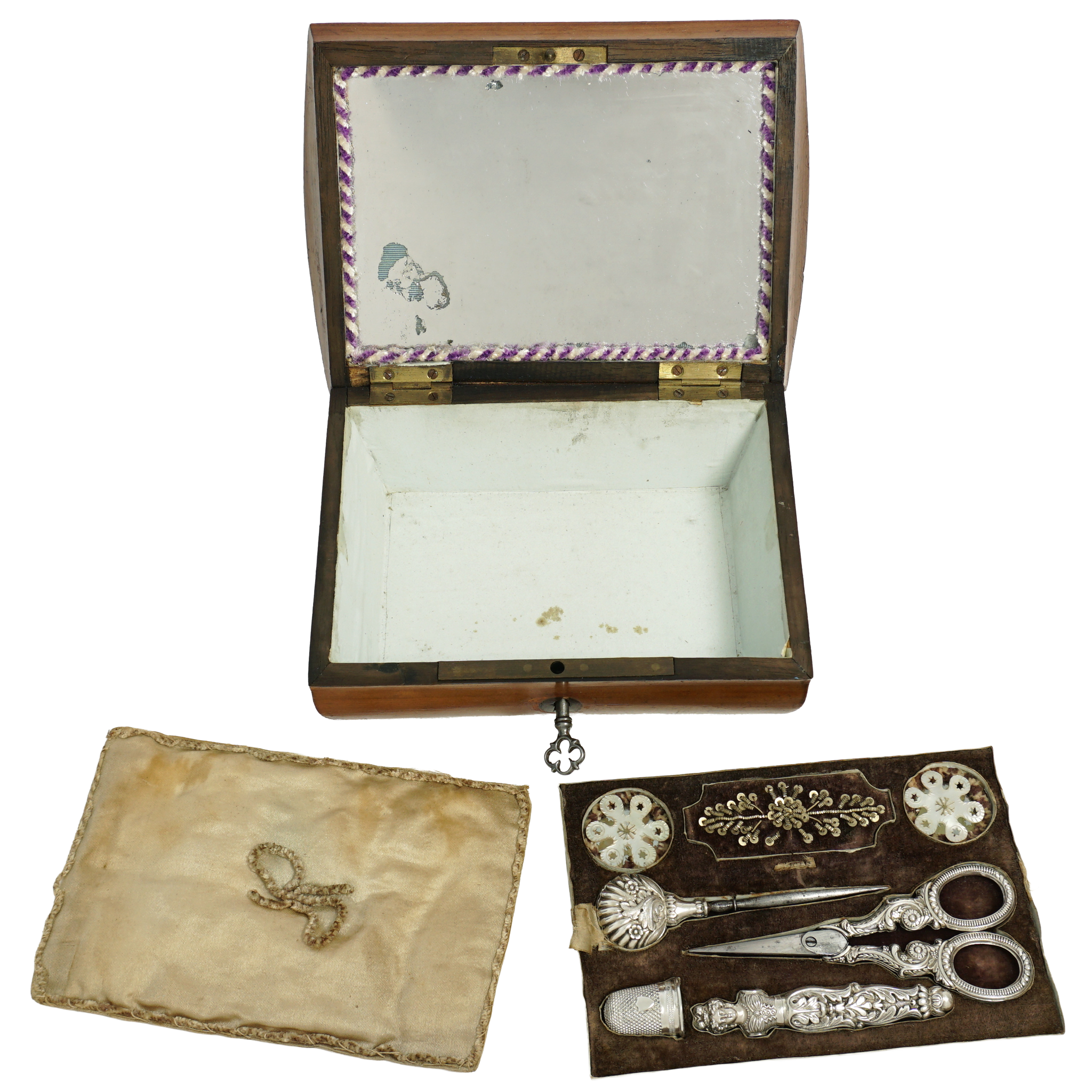 Antique French Palais Royal sewing necessaire. Early 19th century sew box of satinwood with cut steel pique decoration, steel handle to the center. The front with an inlaid wood escutcheon, retains a working lock and key. Resting on four steel bun feet. Opening to reveal the lid interior glass mirror, chenille trimmed silk cushion and removable tray lined with velvet that holds an assortment of exquisitely decorated silver sewing tools in fitted niches. Including scissors, a thimble, awl, figural needle case in the form of a lady, two mother of pearl snowflake thread winders. Silver tools are hallmarked with the head of a hare. The hare head was typically used on small silver items and is a Parisian guarantee mark (poinçon de garantie) in use from 1819 -1838. The mark indicates a silver content of at least .800/1000 and was placed by the Bureau de Garantie de Paris. In overall good antique condition with general wear commensurate with age and use. Nick in the inlaid wood escutcheon, the lid does not sit flush but locks. The scissors with a gap in one of the seams and the thimble with a couple of holes visible when held against the light.