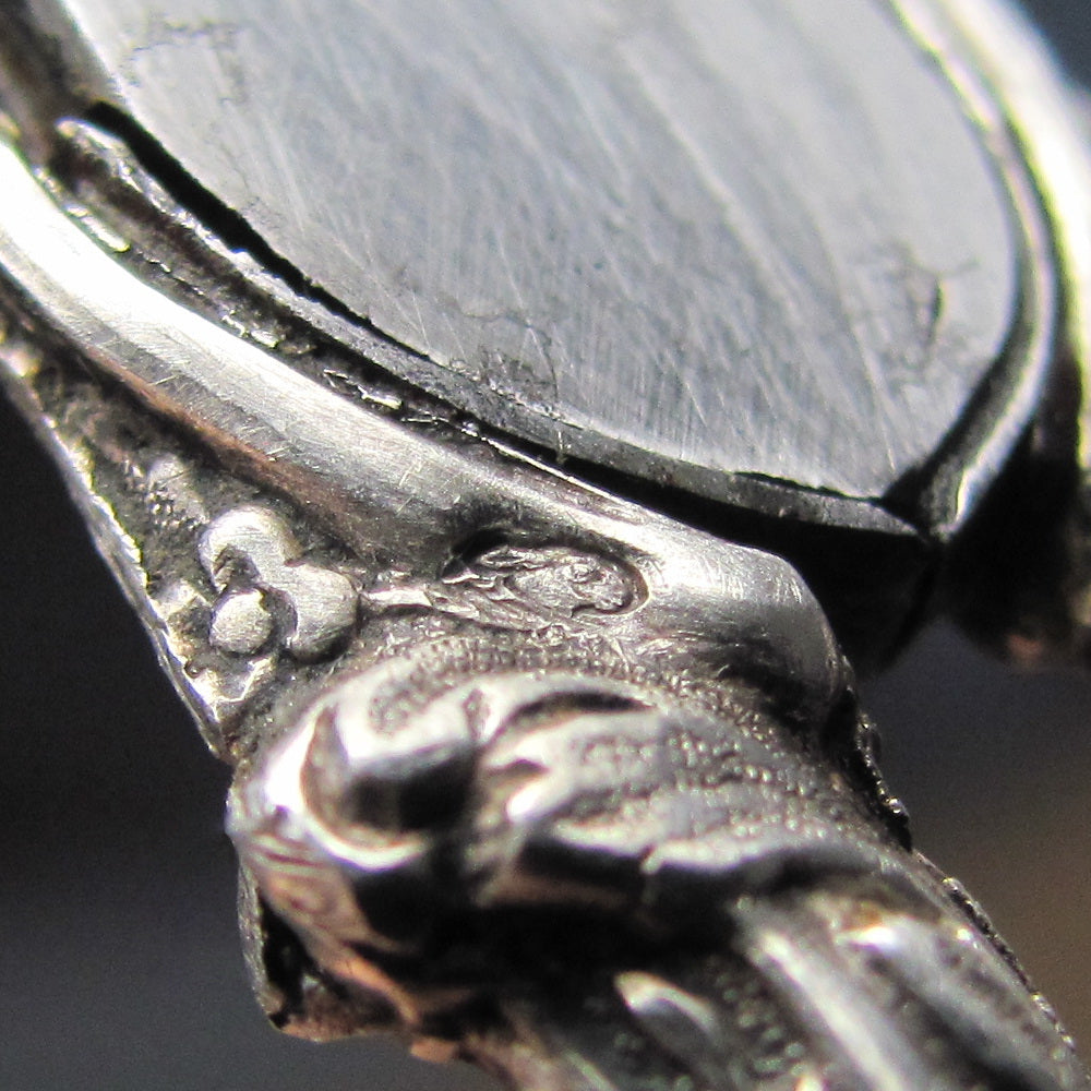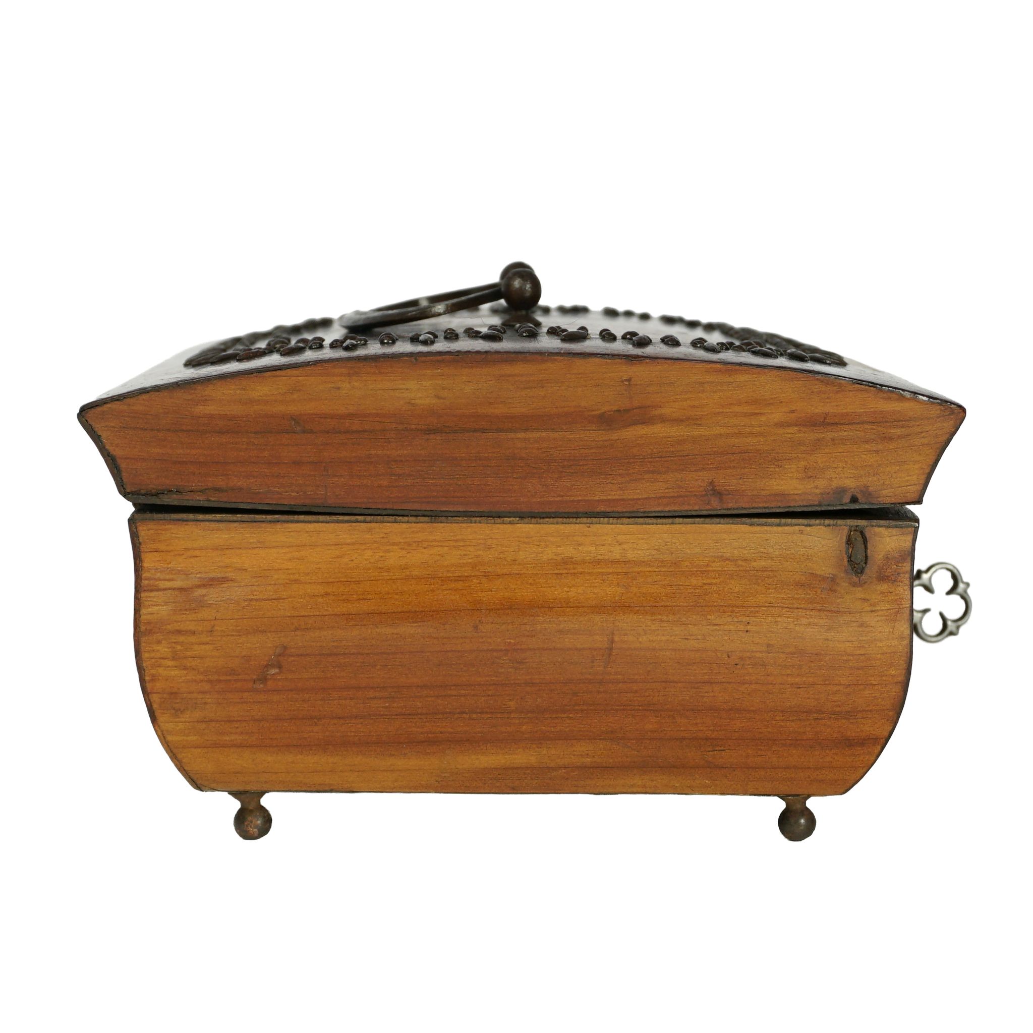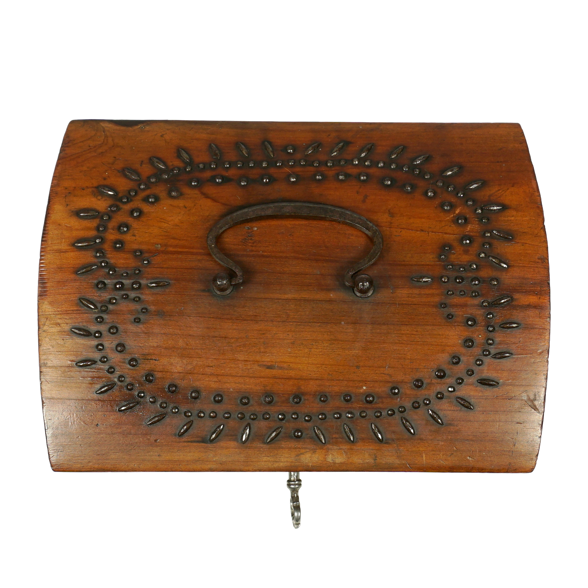 Antique French Palais Royal sewing necessaire. Early 19th century sew box of satinwood with cut steel pique decoration, steel handle to the center. The front with an inlaid wood escutcheon, retains a working lock and key. Resting on four steel bun feet. Opening to reveal the lid interior glass mirror, chenille trimmed silk cushion and removable tray lined with velvet that holds an assortment of exquisitely decorated silver sewing tools in fitted niches. Including scissors, a thimble, awl, figural needle case in the form of a lady, two mother of pearl snowflake thread winders. Silver tools are hallmarked with the head of a hare. The hare head was typically used on small silver items and is a Parisian guarantee mark (poinçon de garantie) in use from 1819 -1838. The mark indicates a silver content of at least .800/1000 and was placed by the Bureau de Garantie de Paris. In overall good antique condition with general wear commensurate with age and use. Nick in the inlaid wood escutcheon, the lid does not sit flush but locks. The scissors with a gap in one of the seams and the thimble with a couple of holes visible when held against the light.