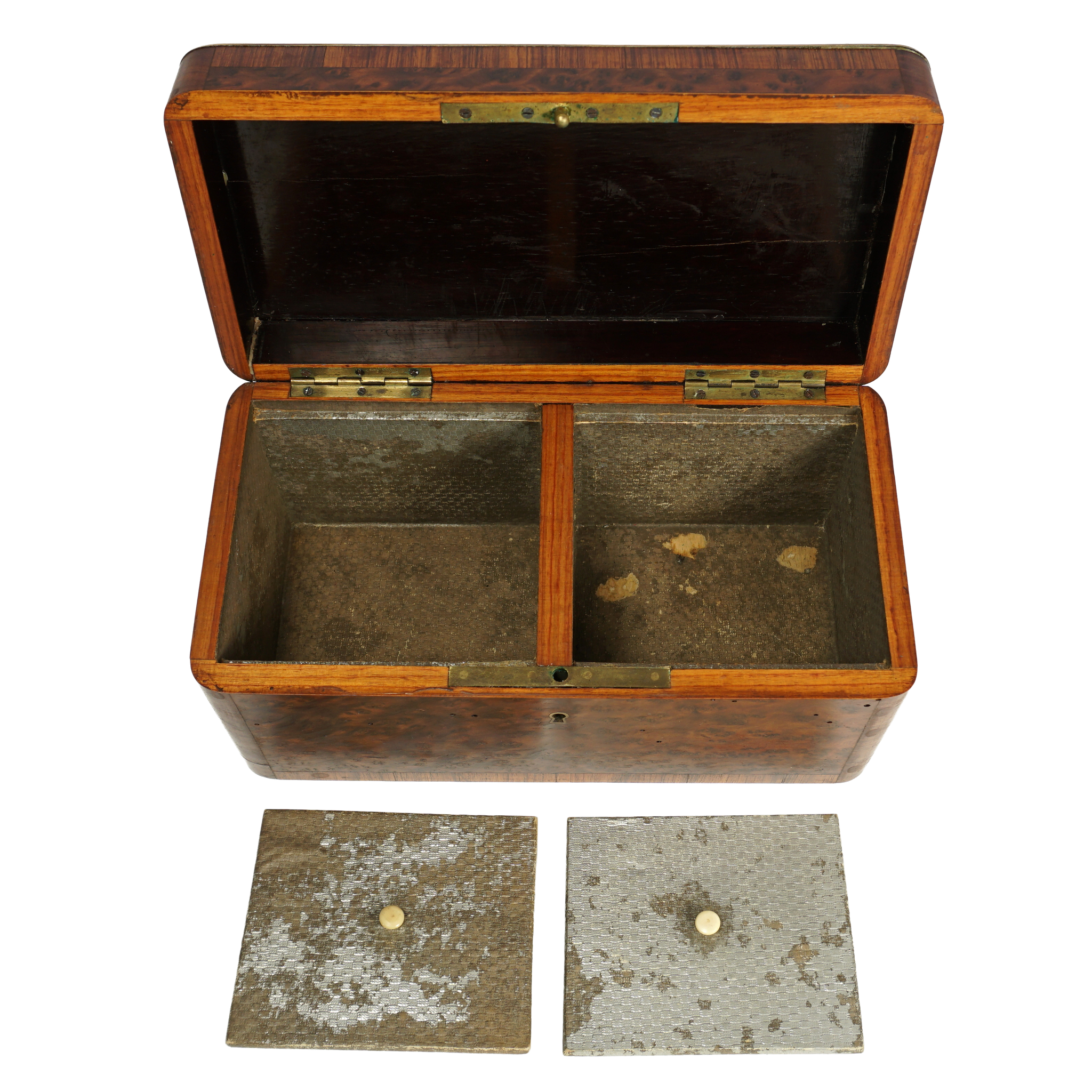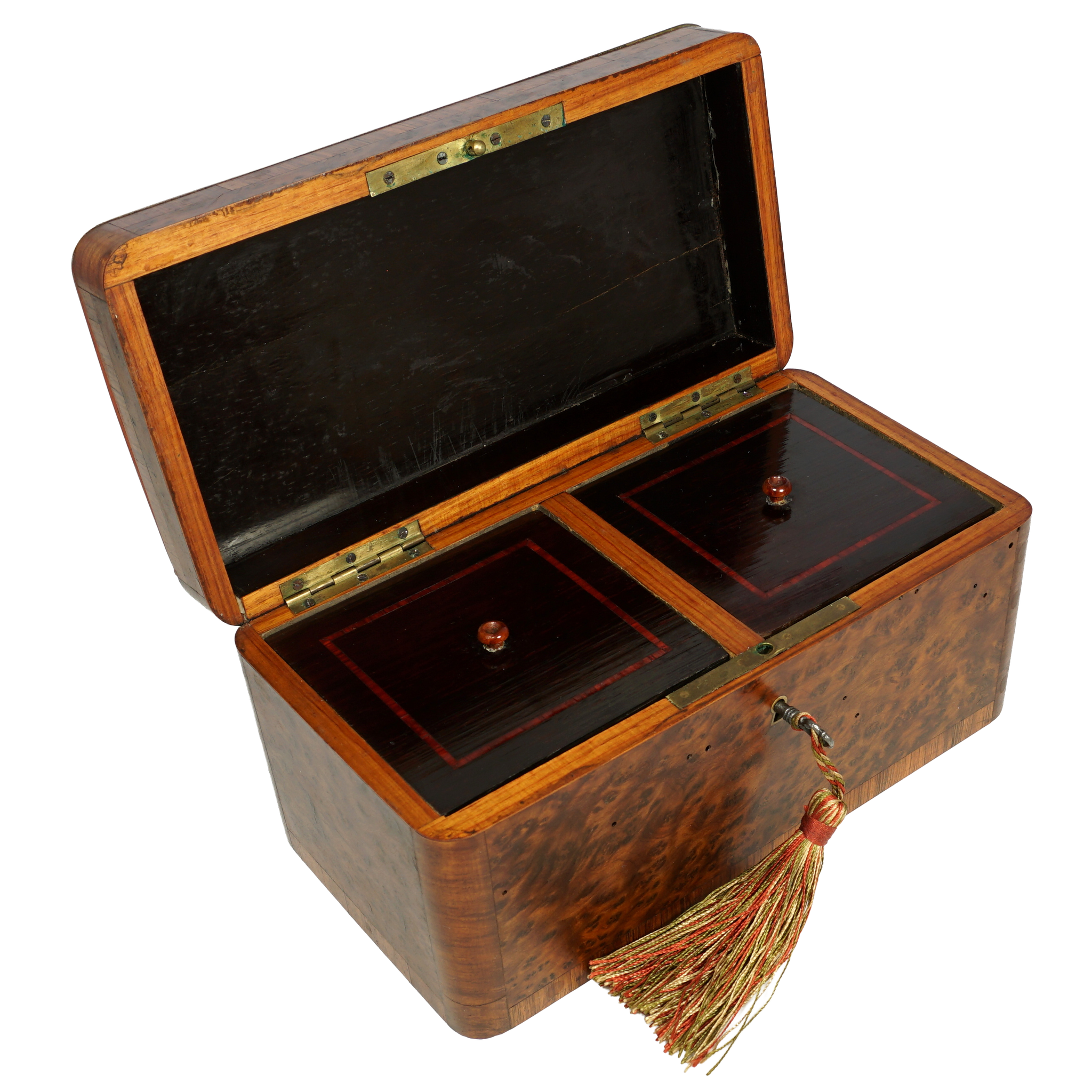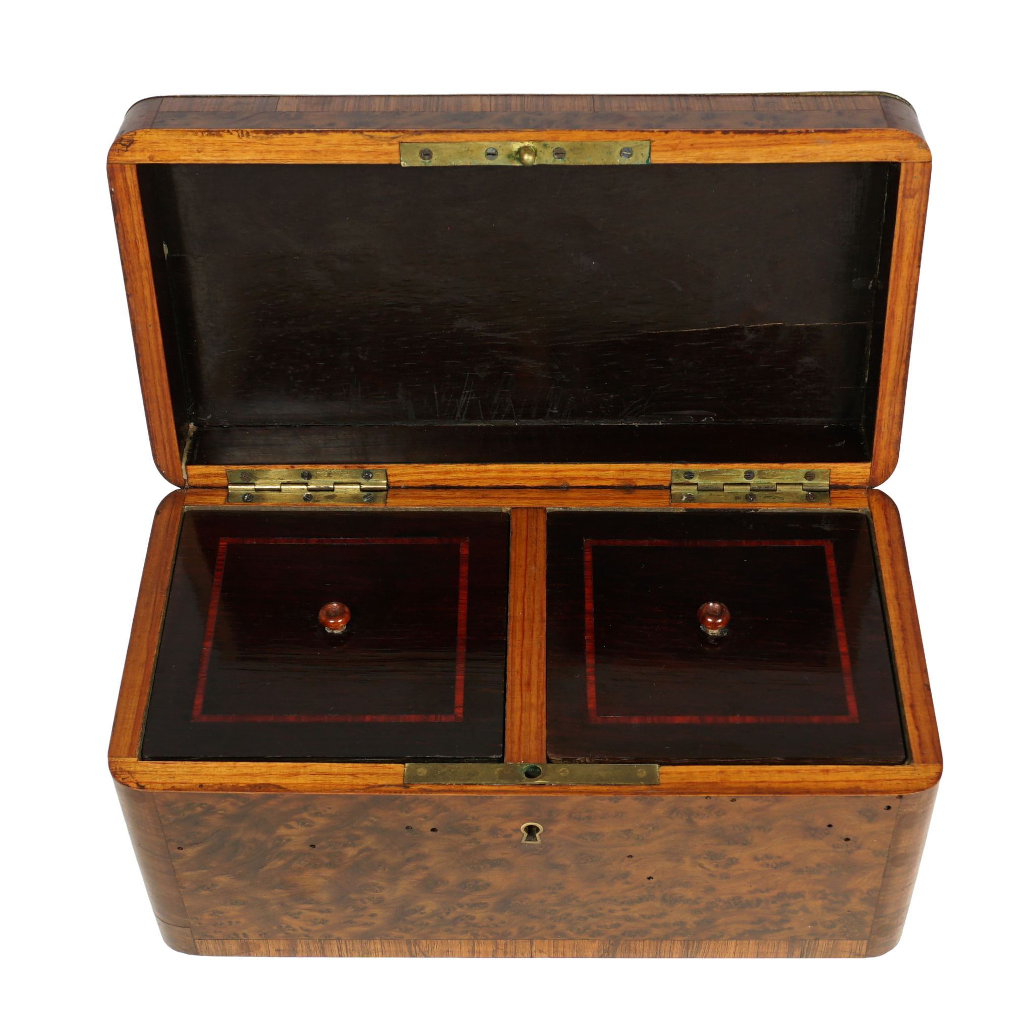 Antique French Napoleon III era marquetry tea caddy box with two compartments. Featuring burl amboyna wood with tulipwood veneers, decorated in brass and ebonized wood inlays. Opens to a mahogany finished interior and a pair of matching lids with rosewood inlay, under these are secondary lids known as floating lids which would sit directly on the tea to help keep the tea leaves fresh. Revealing silver foil lined compartments. Retains a working lock and key. Measures 9 1/8" length x 4 3/4" width x 4 5/8" height.