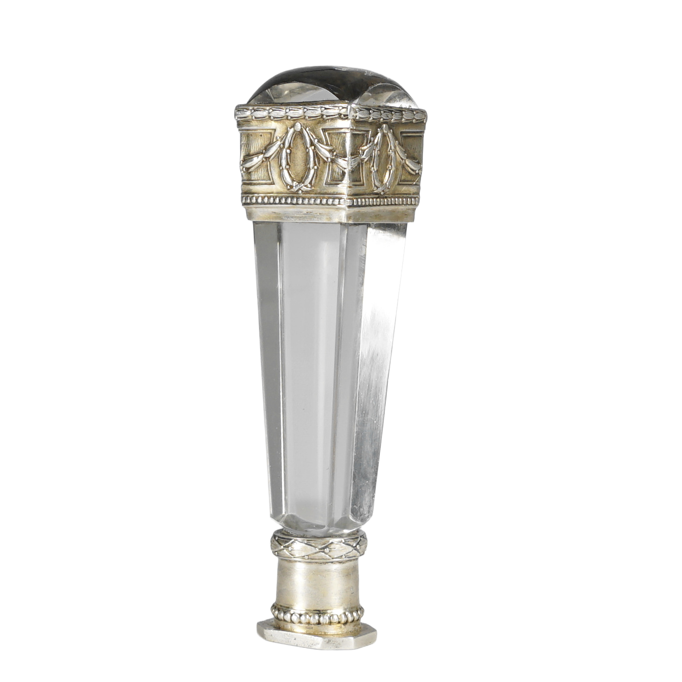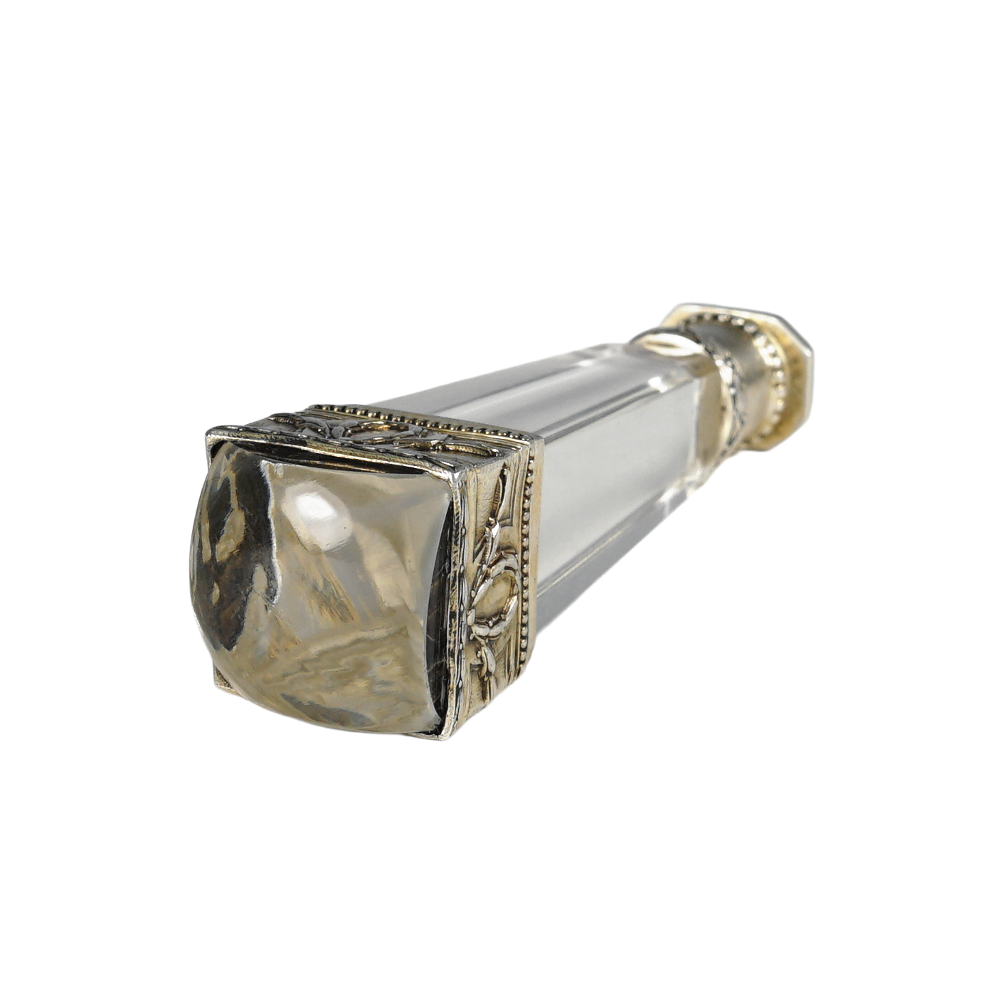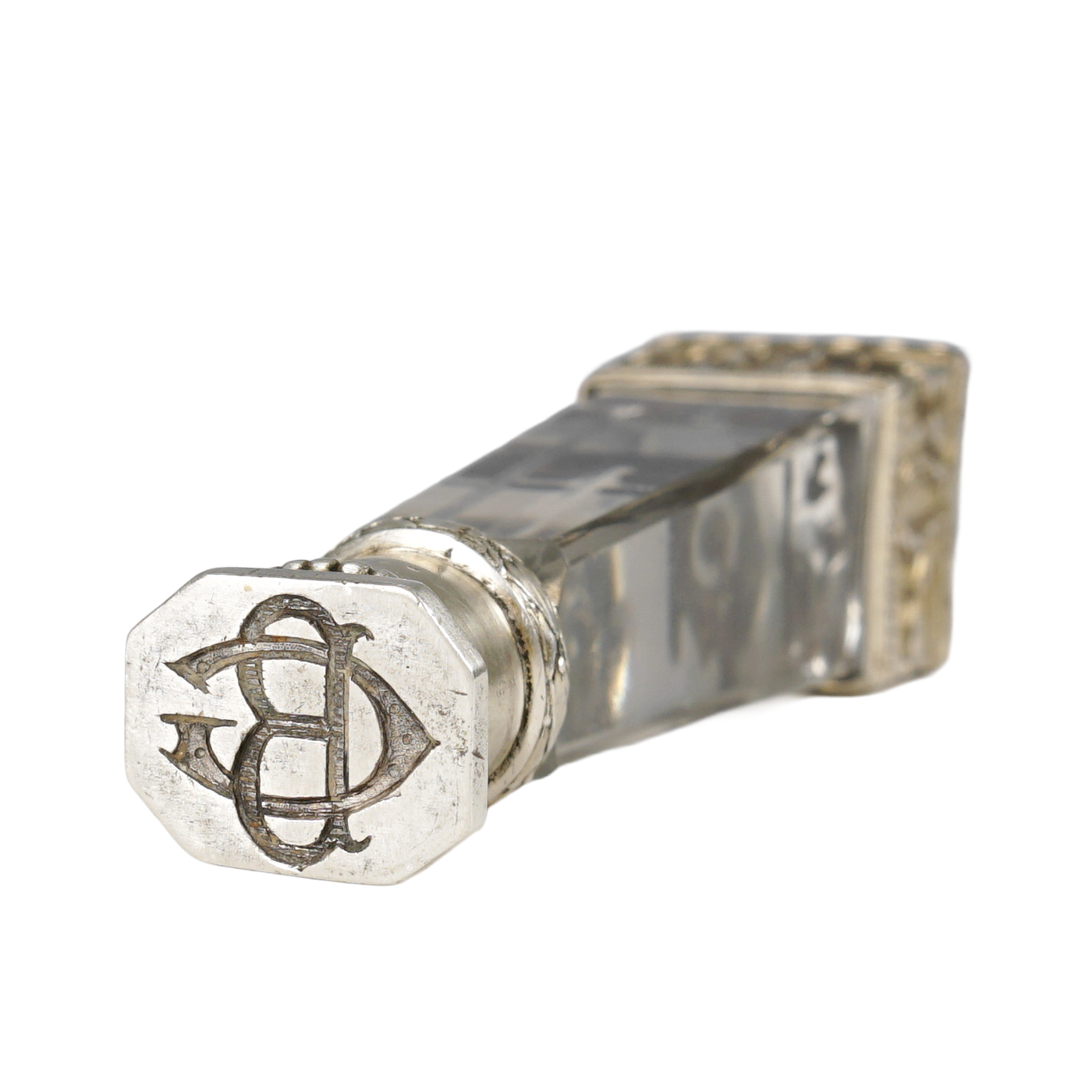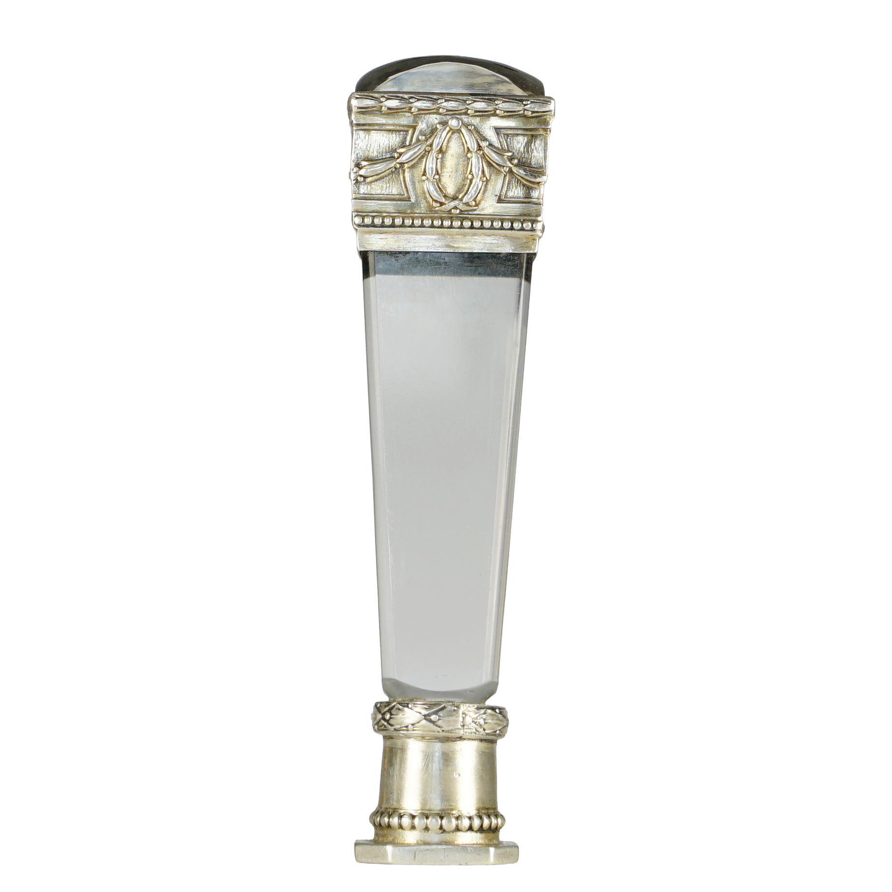 Antique 19th century French wax seal, desk stamp. Solid clear glass tapered handle mounted with a silvered metal band patterned in neoclassical ornamentation. Terminating to a matrix with GB initials. In overall good antique condition with general wear commensurate with age and use. Measures 3 3/8" x 7/8" wide, the matrix measures 5/8" x 1/2".