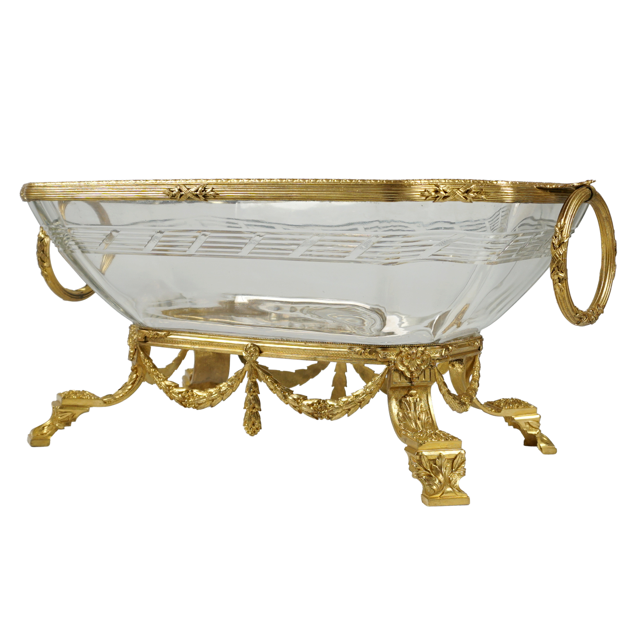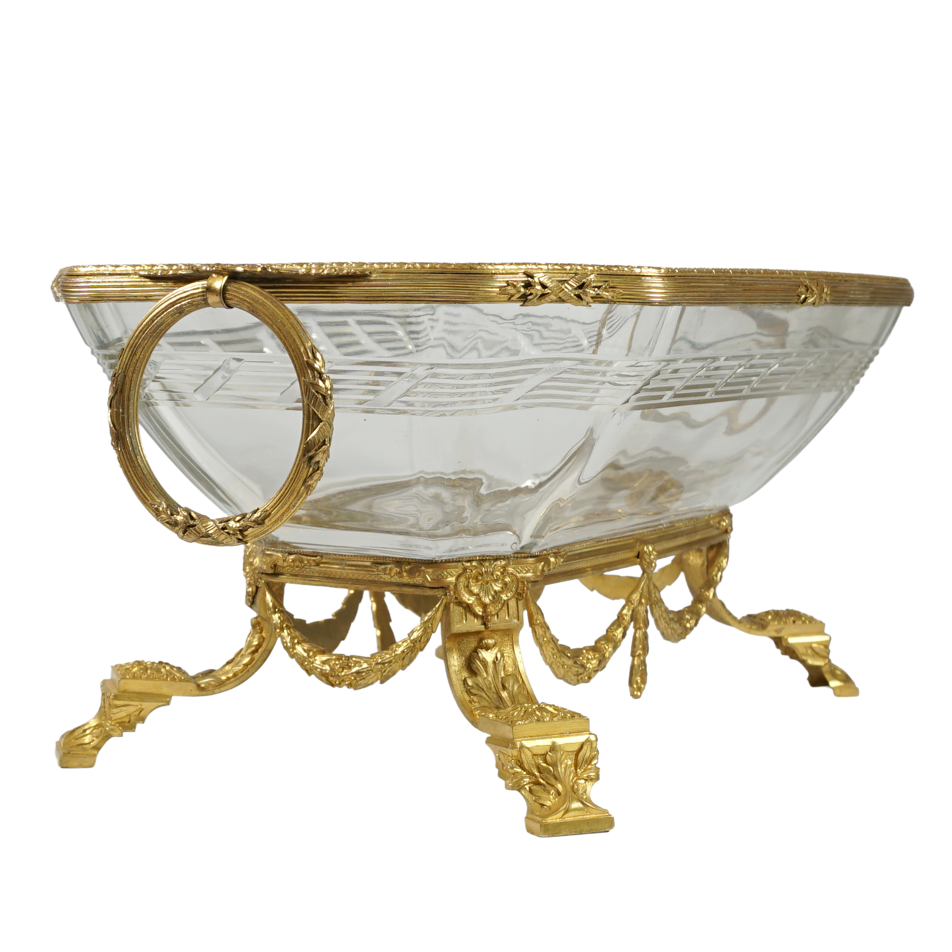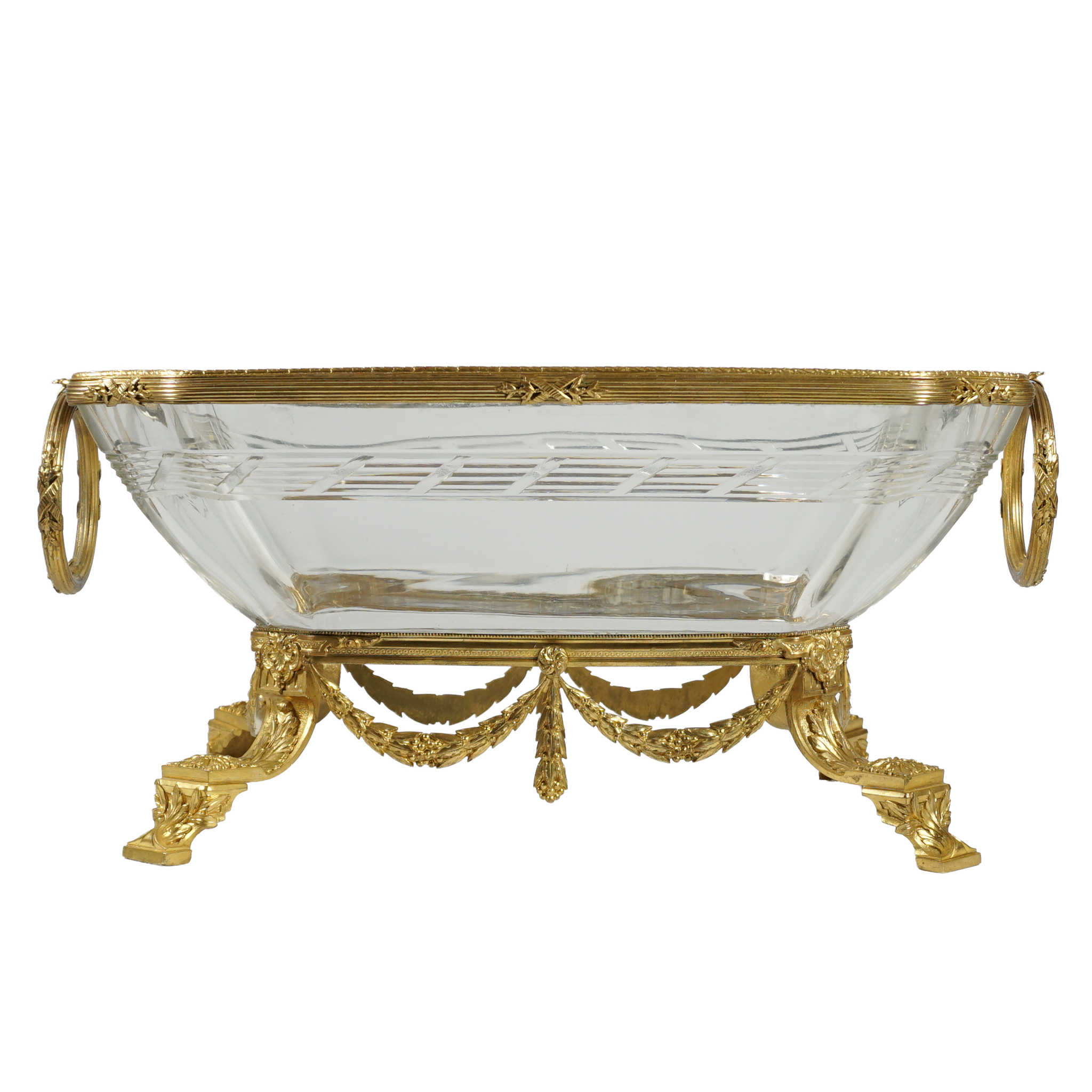 Impressive antique Napoleon III era French cut crystal and ormolu mounted centerpiece. Of quality crystal, in rectangular form decorated with an elegant motif of wheel cut horizontal bands or 'filets'. Finished with a stunning wheel cut 32-point starburst at the base. Encased in gilt bronze mounts, finely casted and sumptuously decorated in opulent neoclassical motifs. The crystal centerpiece is surmounted by a thick gilt bronze edge. Flanked by large loop ring handles topped by embellishments of palmettes and arabesques. Raised on four gilt bronze feet richly decorated in stylized foliate, acanthus and palmettes, garland festoons. Unsigned but most likely Baccarat. The renown cristallerie used paper labels from 1860 on, which were often worn or washed away, and did not use their acid etched signature until 1936. The wheel cut starburst on the bottom is a typical characteristic of the firm and the horizontal fluting is similar to that of patterns such as 'Ecailles & Filets' and 'Chicago'. In overall good antique condition. No chips or cracks to the crystal centerpiece, some minor scratches commensurate with use. Overall a stunning quality piece. Measures 13" across x 7 3/4" wide x 5 7/8" height.
