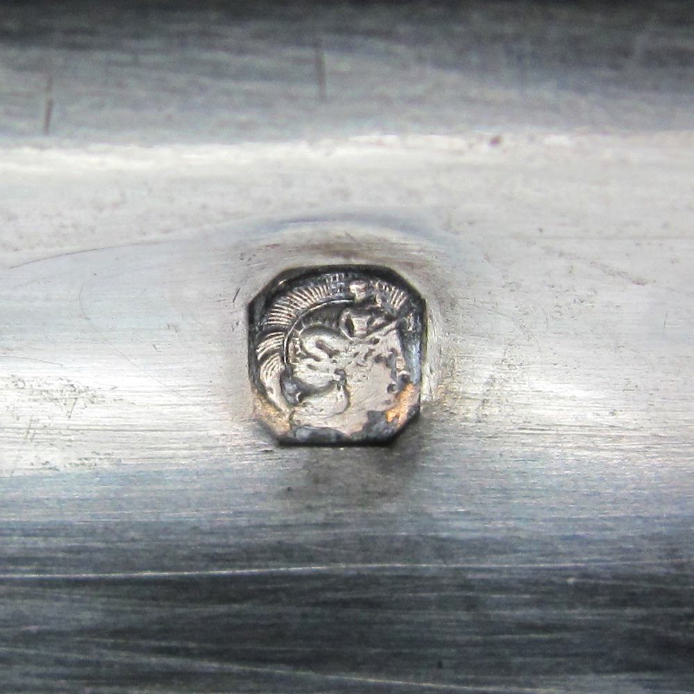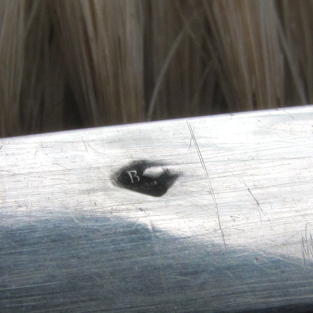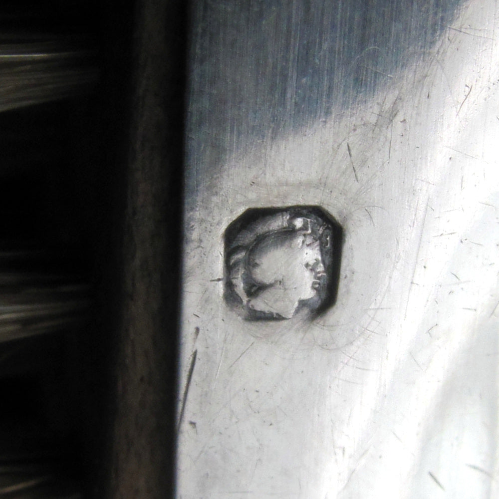 Art Deco era French sterling silver clothes brush set. Comprising of a long and round hand brush with natural bristles, each with intricate guilloche enamel in a lovely shade of purple framed by sterling silver mounts. Hallmarked with the French Minerve 1st standard mark indicating a silver content of .950/1000. Maker's mark for silversmiths Bloch & Eschwege, active 1920-1936. In overall good to fair vintage condition with general wear commensurate with age and use. The long brush having cracks to the enamel as shown. The round brush with some scratches to the surface of the enamel. Round brush measures 5 1/8" length x 3 3/8" width x 1 5/8" height. Long brush measures 6 5/8" length x 1 3/8 " width x 1 1/2" height.