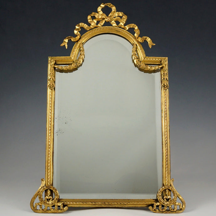 Large Antique French Gilt Bronze Mirror, Neoclassical Decoration, Thick Beveled Glass, Easel Back, Vanity or Dresser Table Top