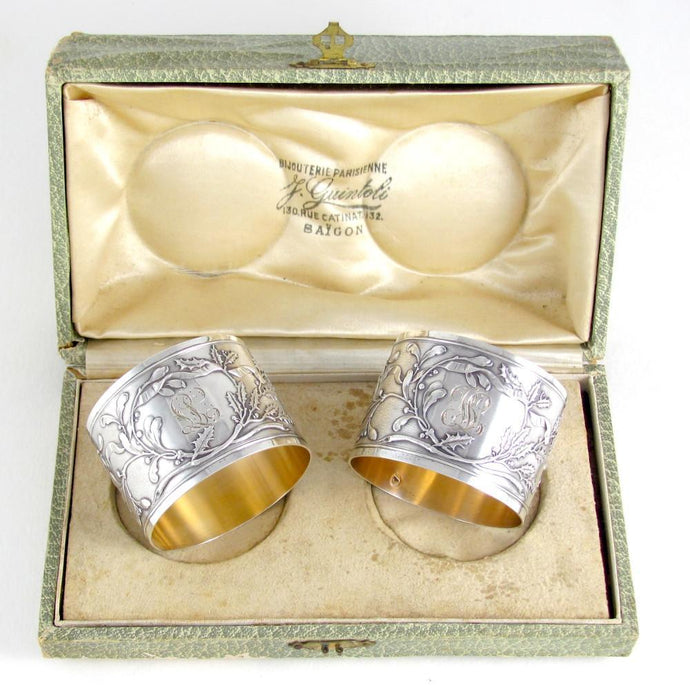 Pair Antique French Sterling Silver Napkin Rings, Neoclassical Foliage & Ribbon